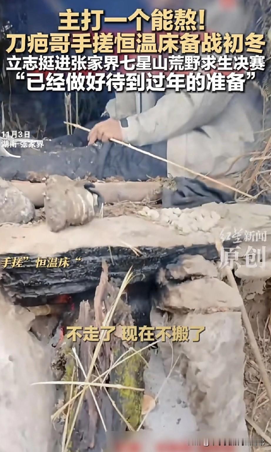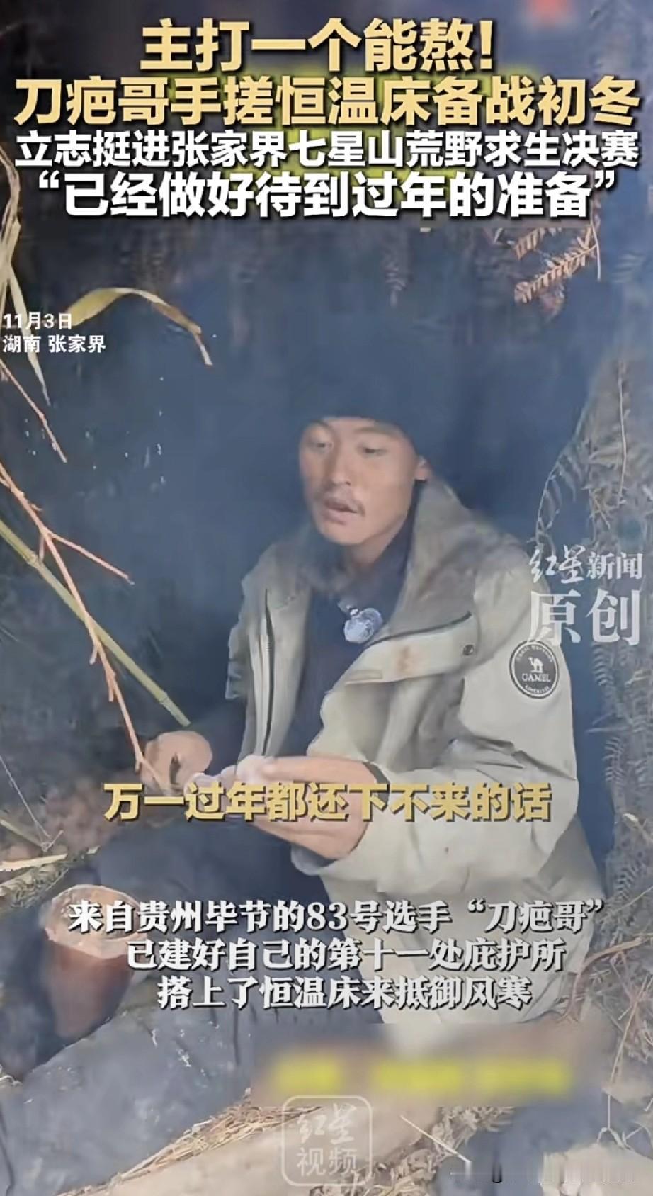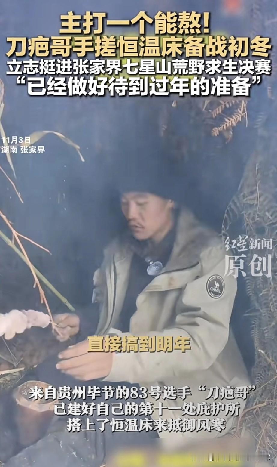 张家界荒野求生刀疤哥放狠话冠军非他莫属! 张家界七星山这波操作绝了!“刀疤哥”在荒野里徒手造了个恒温床,还烤着串儿放话:“就算过年也不出去!” 这哥在山里造了11处庇护所,现在直接把“家”安在恒温床里,烤串的架势比夜市摊主还专业。别人荒野求生是挑战,他这是把山林当自家后院过日子啊! 你说他是真·荒野硬汉,还是在这儿玩过家家?要是换你在山里待仨月,能比他活得还滋润不?