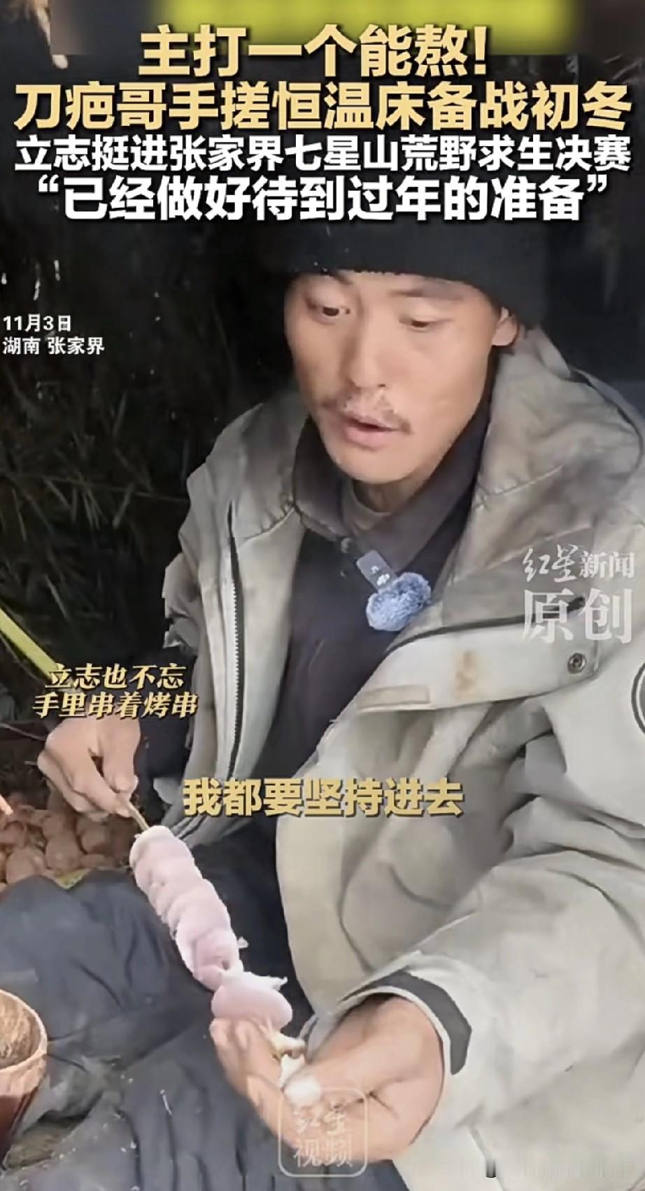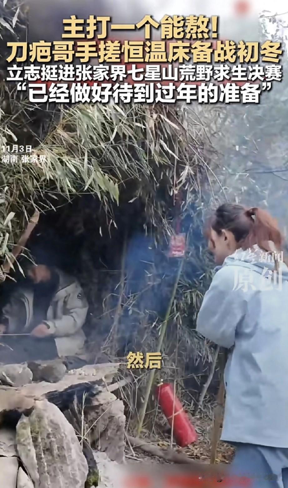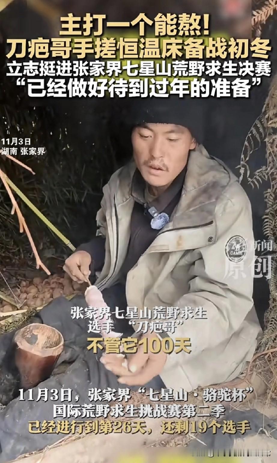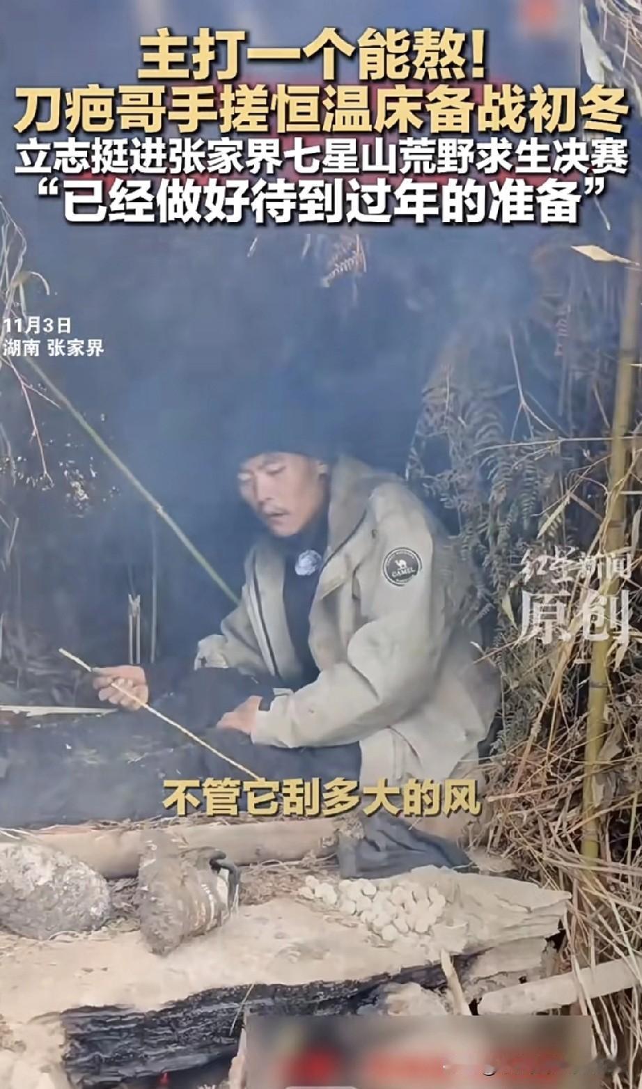 张家界荒野求生刀疤哥放狠话冠军非他莫属! 张家界七星山这波操作绝了!“刀疤哥”在荒野里徒手造了个恒温床,还烤着串儿放话:“就算过年也不出去!” 这哥在山里造了11处庇护所,现在直接把“家”安在恒温床里,烤串的架势比夜市摊主还专业。别人荒野求生是挑战,他这是把山林当自家后院过日子啊! 你说他是真·荒野硬汉,还是在这儿玩过家家?要是换你在山里待仨月,能比他活得还滋润不?