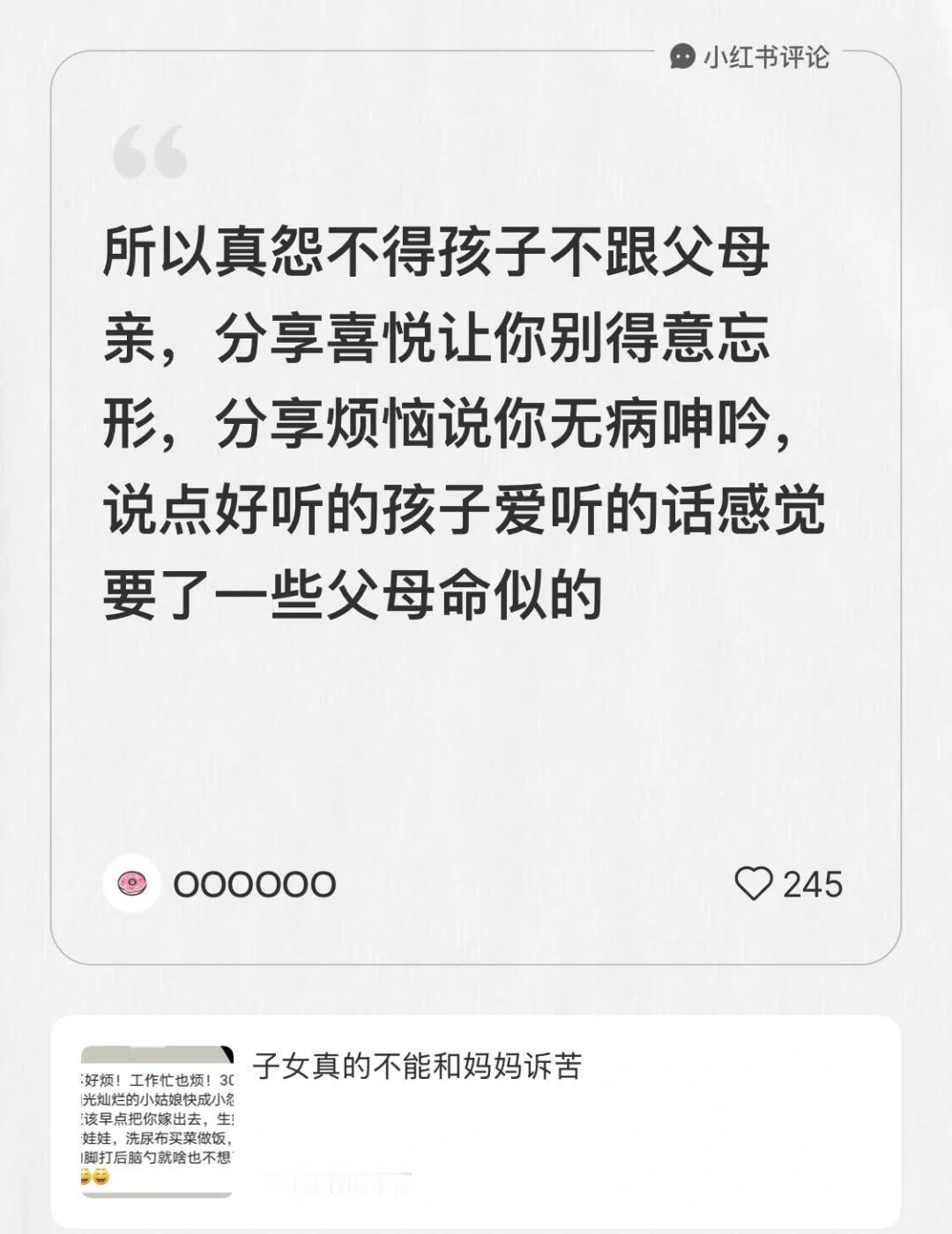 没想到竟然获得那么多赞。 我在老白涮肉坊的笔记[笔记]下发布了一条评论 所以真怨不得孩子不跟父母亲,分享喜悦让你别得意忘形,分享烦恼说你无病呻吟,说点好听的孩子爱听的话感觉要了一些父母命似的。 没想到竟然获得那么多赞,看来大家都有同样的烦恼😣父母 希望更多人看到 补充近期的感受:不分享说你翅膀变硬[捂脸]