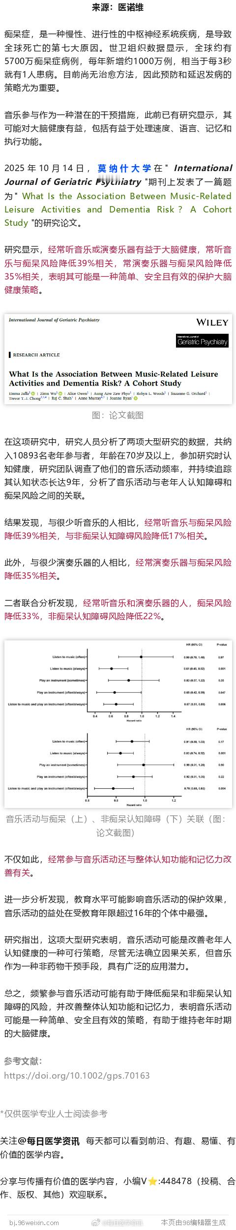 2025年10月14日,莫纳什大学在" International Journal of Geriatric Psychiatry "期刊上发表了一篇题为" What Is the Association Between Music-Related Leisure Activities and Dementia Risk?A Cohort Study "的研究论文。