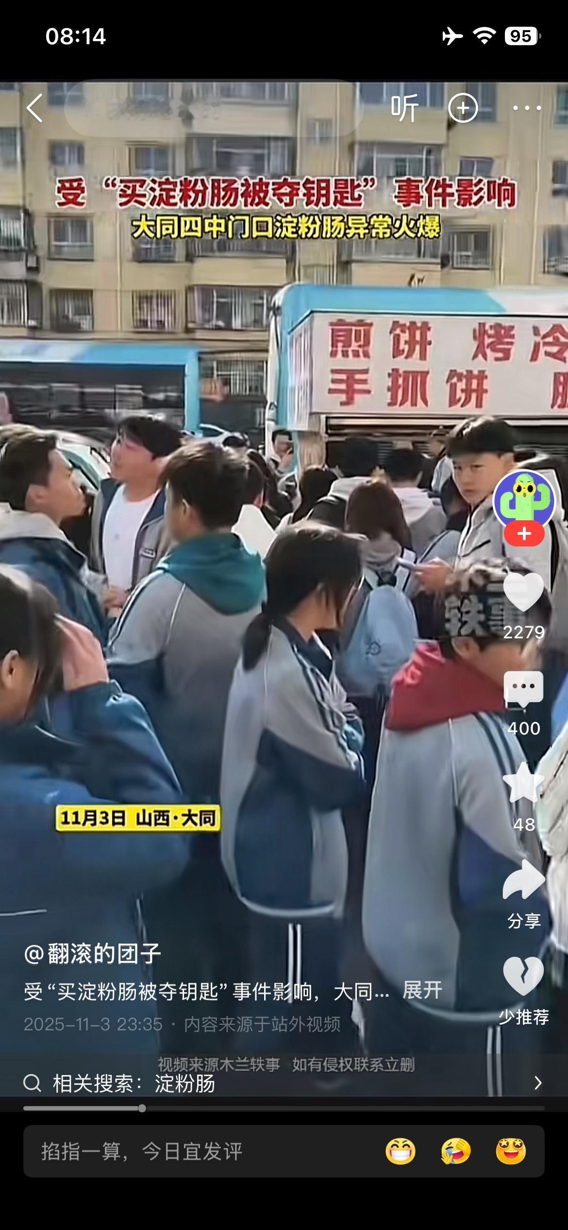 大同四中真的火了,各路自媒体踊跃报道,类似视频充斥网上,太多神评论。这下好了,不就是学生校外买淀粉肠吗?至于私自没收、夺取学生的车钥匙吗。看来下学期的生源不愁,这就是免费的招生广告啊。 现在摊位管理费也该搞一搞了,校附近的小摊肯定要多起来了。