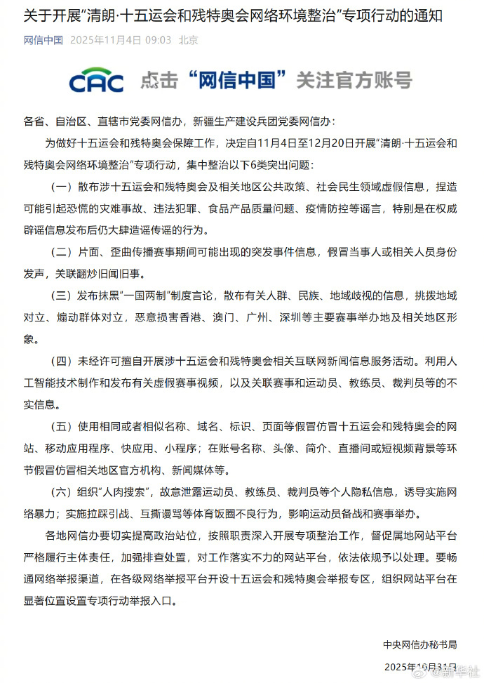 #整治十五运会和残特奥会网络环境6类突出问题#【关于开展“清朗·#十五运会和残特奥会网络环境整治#”专项行动的通知】为做好十五运会和残特奥会保障工作,决定自11月4日至12月20日开展“清朗·十五运会和残特奥会网络环境整治”专项行动,集中整治以下6类突出问题: