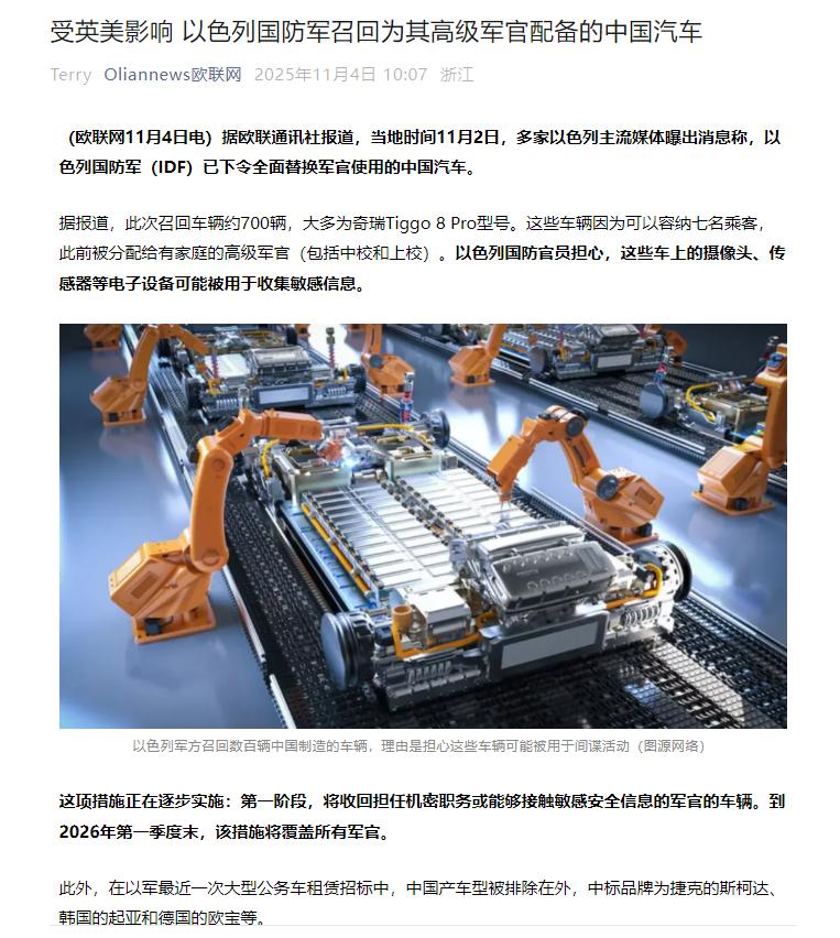 以色列国防军突然宣布了,要召回大约700辆此前配发给高级军官的中国产汽车,理由是担心存在数据安全和监控隐患。 这话听着是不是挺耳熟?但你把这事的前因后果捋清楚就知道,这既不是专门针对中国,也算不上啥信任危机,更像是军事这块儿的特殊规矩。 先说说这批车的情况。主角是奇瑞的瑞虎8 Pro,从2022年开始,一批批发给了以色列国防军的中校、上校级军官。选它也是有原因的,这些军官大多家里人多,瑞虎8 Pro是七座的,刚好能满足家庭用,实用得很,所以才成了军方采购的热门货。这两年多,这些车一直是军官们的日常座驾,没出啥问题,直到今年,风向突然就变了。 情况变了,是从以色列军方一道禁令开始的:从今年起,中国产的智能汽车不准进军事基地。紧接着,总参谋长直接下命令,把这700辆奇瑞车全收回来,动作又快又干脆。核心担心的点也很具体,就是怕车里的硬件“走漏消息”。 军方列出来的敏感零件有车载摄像头、内置麦克风、雷达还有定位模块,担心这些东西会悄悄记下来军事基地在哪儿、军官们常去什么地方这些敏感信息。 要是站在军事安全的角度看,这种担心也不是完全没谱。现在的智能汽车早不是只带四个轮子的“大沙发”了,而是装满了各种传感器的移动智能设备。定位模块能实时记着车开去哪儿了,要是军官开车进出于保密的地方,位置信息就有泄露的风险;摄像头和麦克风虽说主要是帮着开车、跟车机互动用的,但在特殊情况下,确实有采集信息的可能。 以色列常年都在安全敏感的环境里,对军事信息的保护向来是一点风险都不愿留,哪怕只是潜在的问题,也得掐灭在苗头里。 但话说回来,把“可能有风险”直接当成“肯定会泄密”,就有点过头了。中国汽车企业做出口生意,早把数据安全当成了底线。像奇瑞这样的车企,出口的车都得符合当地的安全规定,数据存哪儿、怎么传,都有严格的规矩,不会随便碰信息安全的红线。 而且这批瑞虎8 Pro是民用车型,本来就不是为军事场景设计的,压根没有专门收集信息的功能,所谓的“监控隐患”,更多是凭着设备功能瞎猜,不是真的发生了这样的事。 更有意思的是这事里的反差:当初买它,是因为车符合需求;现在收回去,是因为军事场景的安全要求不一样了,本质上就是“用的地方变了,安全标准也得跟着变”。 以色列军方没说奇瑞车质量有问题,也没说中国企业做了啥出格的事,就是单纯觉得民用智能汽车的安全标准,跟不上军事领域的保密要求。这种就事论事的态度,和有些国家动不动就拿“安全”当借口搞贸易壁垒,完全是两码事。 其实这几年,中国汽车在全球市场上越来越有存在感,不光老百姓买车会选,有些国家的公务车、执法车也常用中国车。这背后靠的是车的性价比高、实用,也是全球市场对中国制造业的认可。而军事领域对信息安全的要求本来就特别严,别说中国车了,其他国家的智能设备想进军事核心区,都得经过一层又一层的检查。 所以说到底,这次700辆奇瑞车被收回去,更像是军事安全上的一次常规调整。没必要过度解读成“中国车不安全”,也犯不着上升到外交层面。对中国车企来说,这倒是个提醒,随着智能汽车卖到更多地方,针对不同的使用场景,安全方面的适配得做得更细致。 对咱们旁观者来说,看明白这事背后“用的地方不一样,要求就不一样”的道理,比跟着瞎起哄更重要。毕竟,好用的东西不会因为一次特殊调整就没人要,中国汽车在全球的路,还在稳稳地往前走呢。