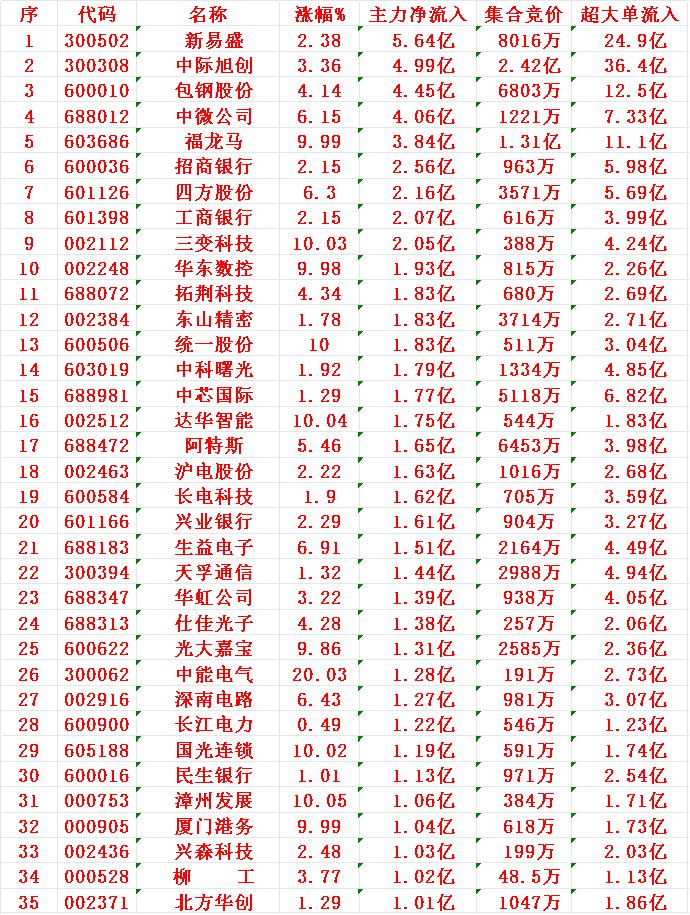 11月4日开盘45分钟,主力资金“买入的 ”的35名单一览! 新易盛:净流入 5.64亿元 中际旭创:净流入 4.99亿元 包钢股份:净流入 4.45亿元 中微公司:净流入 4.06亿元 福龙马:净流入 3.84亿元