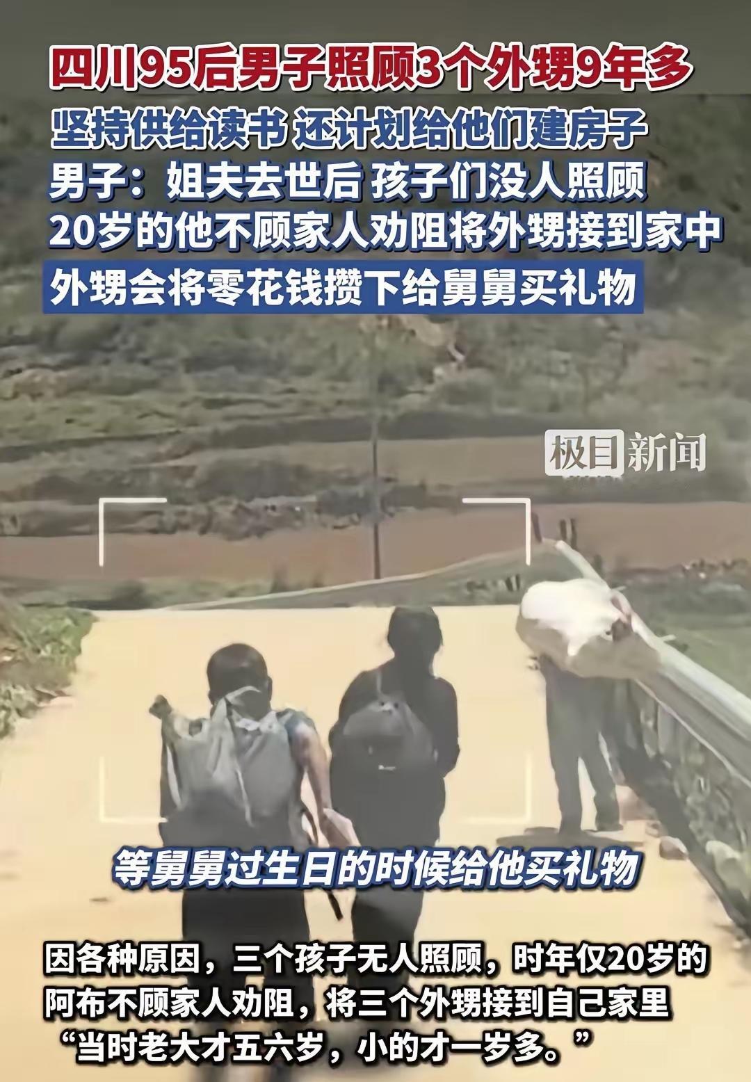 刷到个四川95后舅舅的故事,看完眼眶都热了!这亲情也太戳人了! 四川有个95后男生,一照顾就是3个外甥,这一管就是9年多,不光供他们读书,还想着以后给孩子们建房子。 换作别人,这么多年又当爹又当舅的,早扛不住了吧?可他没抱怨,反倒把外甥们的生活安排得明明白白。更暖的是,外甥们也懂事,平时舍不得花零花钱,攒着就给舅舅买礼物。 好多人说,这才是亲情该有的样子——你为我遮风挡雨,我把心意藏进小礼物里。不是亲爸胜似亲爸,这样的舅舅,真该让更多人知道! 这个故事之所以让人感动,是因为它颠覆了我们对“责任”的常规想象。一个二十出头的年轻人,本可以追求自己的人生,却选择为三个外甥撑起一片天。这背后,是超越血缘的担当和爱。 他用行动告诉孩子们,什么是“家人”。而孩子们回馈的,是最纯粹的依赖和感恩。这种双向奔赴的亲情,才是最能治愈人心的力量。外孙舅舅关系