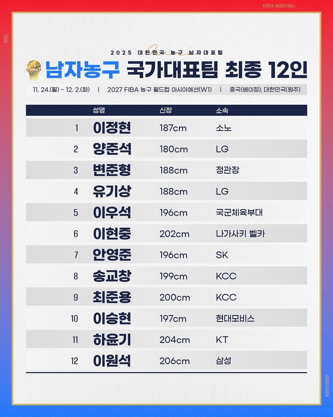 韩国男篮已经公布了世预赛对阵中国男篮的12人大名单,李贤重领衔,今年亚洲杯不少成员都在。