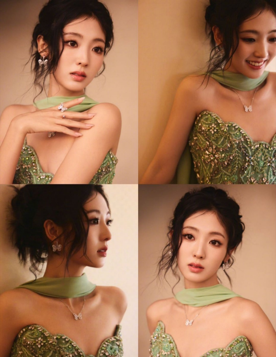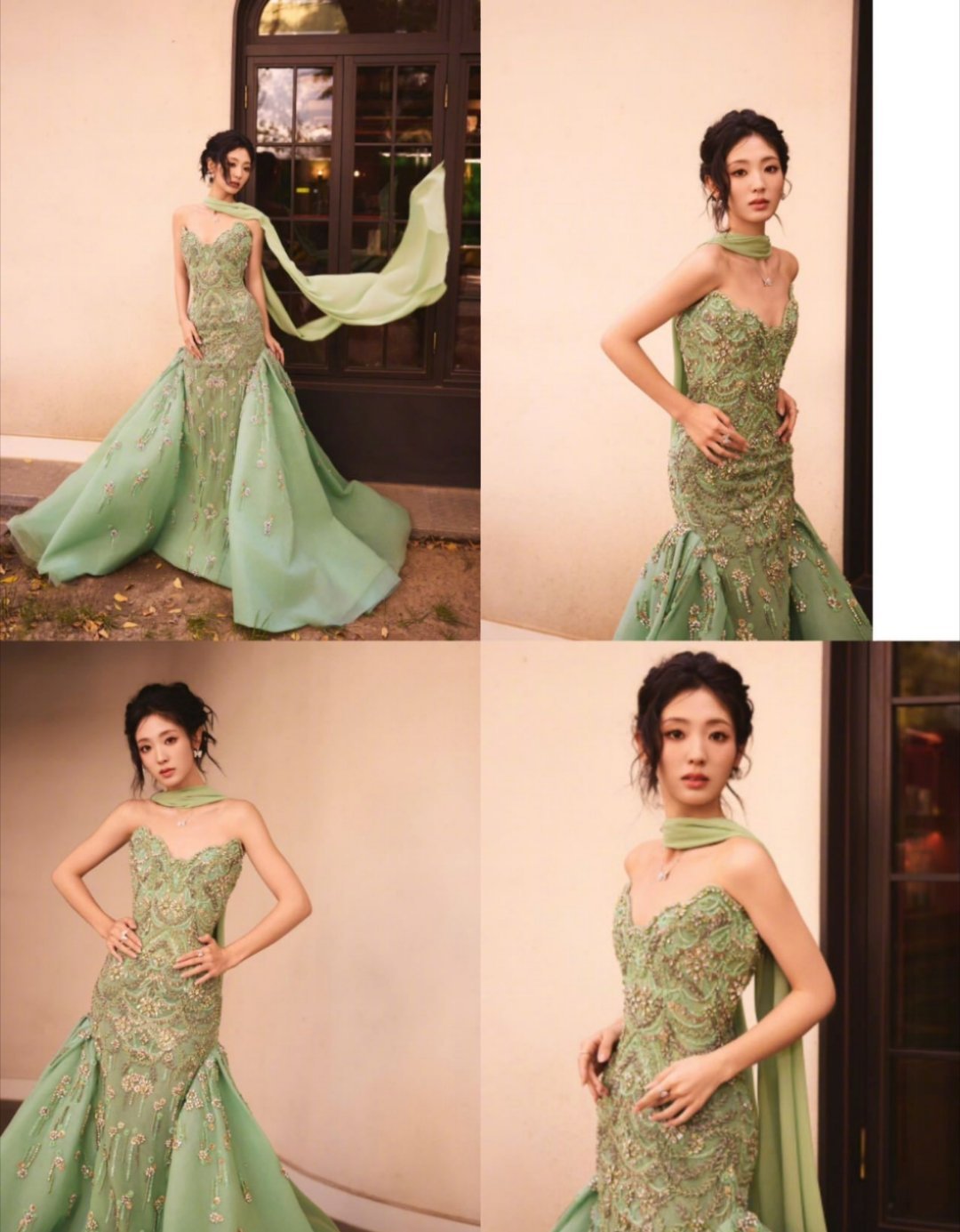 邢菲只需稍微出手绿色长裙也好看,优雅又高级[送花花]什么风格都能驾驭!