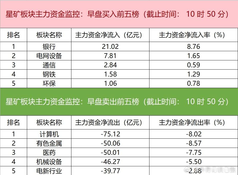 今日早盘主力资金净流入银行、电网设备、通信等板块,净流出计算机、有色金属、医药等板块,其中计算机板块净流出超75亿元。个股方面,新易盛上涨,主力资金净买入超6亿元位居首位,中际旭创、福龙马、包钢股份获主力资金净流入居前;常山药业遭净卖出超7亿元,三花智控、阳光电源、亿纬锂能资金净流出额居前。