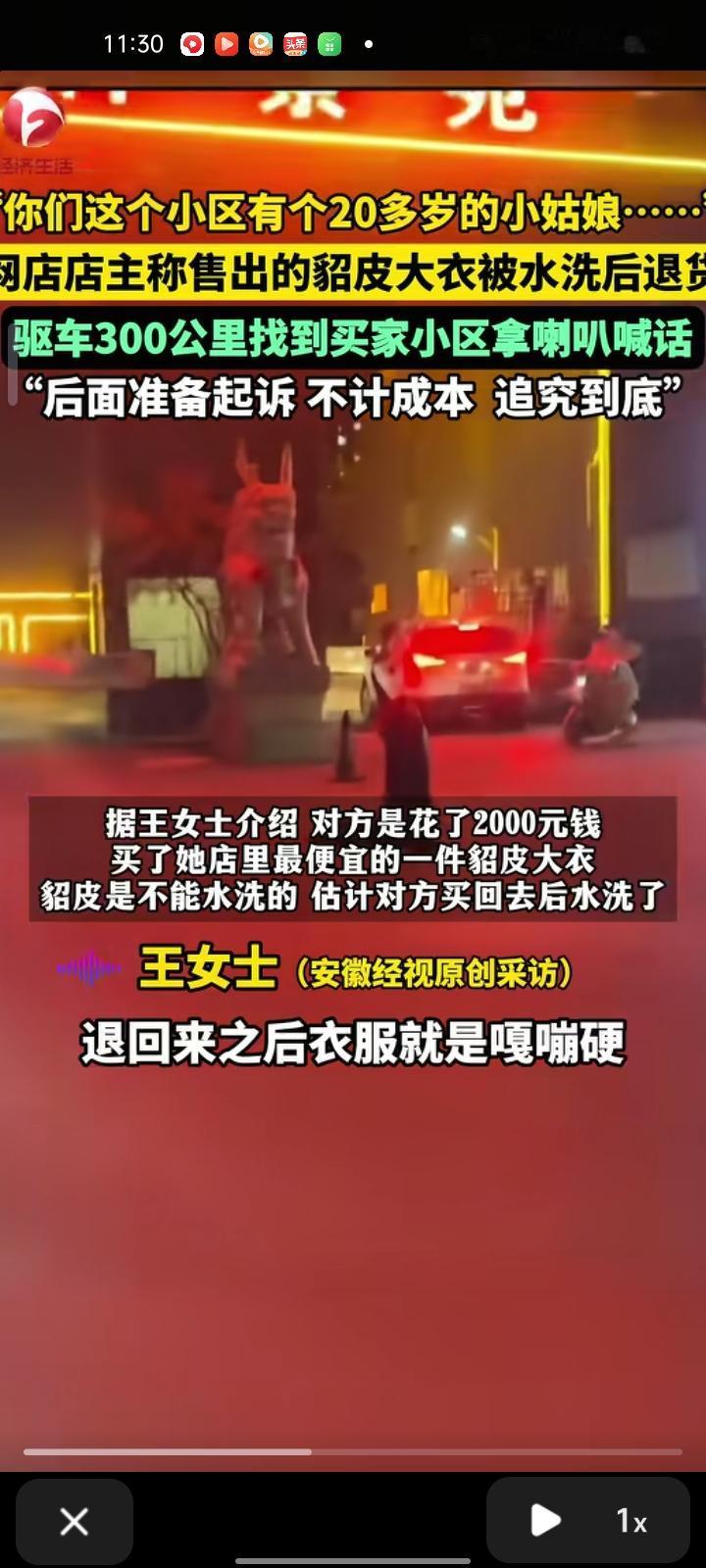 11月3日,济宁市嘉祥县。网店店主称,自己把貂皮大衣卖给20多岁的小姑娘,衣服洗报废后恶意退货,驱车300公里来到麟祥景苑小区拿喇叭喊话。 店主王女士称,对方是花了2000元购买她店里最便宜的貂皮大衣,貂皮不能用水洗,估计对方买回去后水洗了。对方退回去后衣服嘎嘣硬,跟塑料一样,给她打微信、电话都不接,报警后对方死活不见面。这种现象属于零容忍,后面准备起诉,不计成本追究到底。