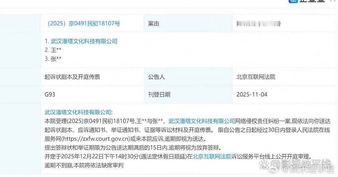 近日,法院向武汉潘塔文化科技有限公司公告送达王一博与其网络侵权责任纠纷一案起诉状副本及开庭传票等,案件定于2025年12月22日下午14时30分在北京互联网法院诉讼服务平台线上公开开庭审理。