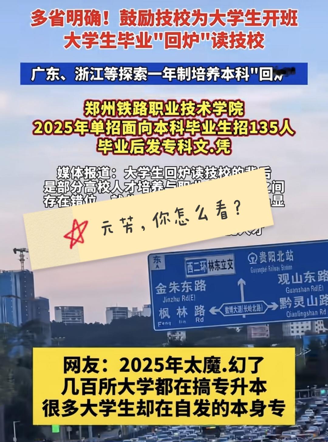技校这是要迎来春天了吗? 大学生毕业后, 鼓励他们回炉读技校[我想静静] 家长们,你们会接受吗❓️‼️ 以前我只知道专升本 现在这世界真的风水倒着转了吗? 可能是我肤浅了 技校的确接地气 但是本科生回来再读技校 学得到真本领吗❓️ 归根结底是就业问题 就算本科加持技校毕业, 就能就业前景宽广了? 家长还得继续几年承担技校费用 为啥大学不叠加 开设相关技能专业 本科期间一起学呢? 孩子们现在要毕业了, 你说有就业需求和大学之间培养有错位, 要回炉修炼 为啥你不完善自己接地气一些呢! 这皮球踢给谁接着❓️