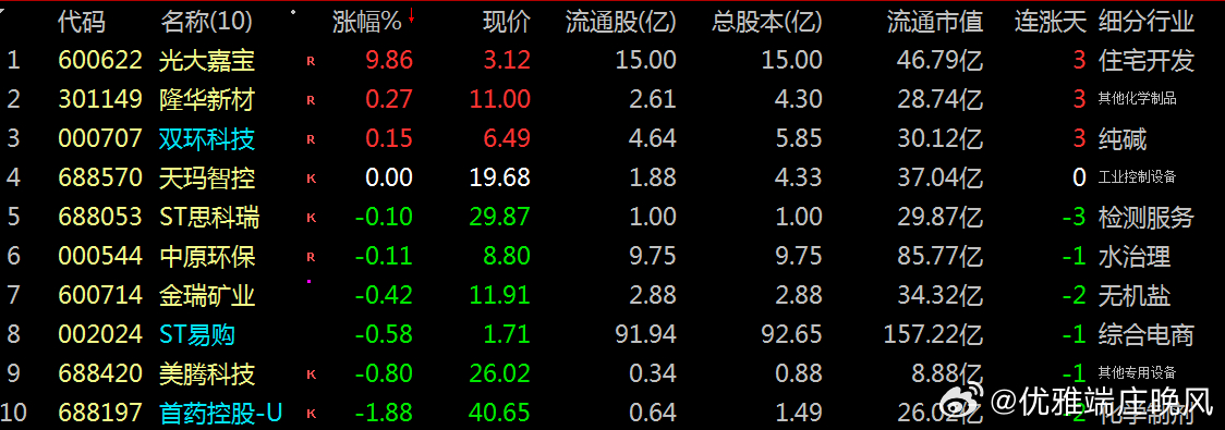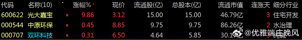 600622 光大嘉宝 000707 双环科技 000544 中原环保 301149 隆华新材