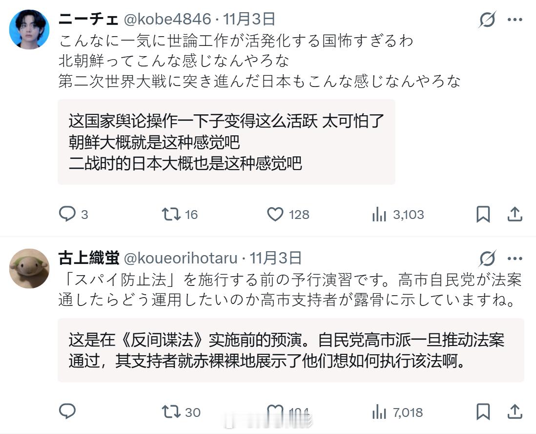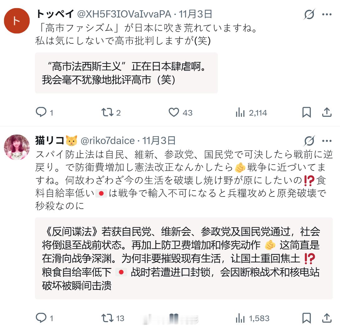 很多日本网民也对目前日本的政治舆论生态感到担忧,甚至有了“高市法西斯”的说法,他们明显感觉现在的政权非常像二战前的日本,担心国家再次滑入战争的深渊。