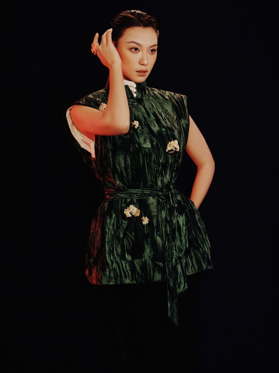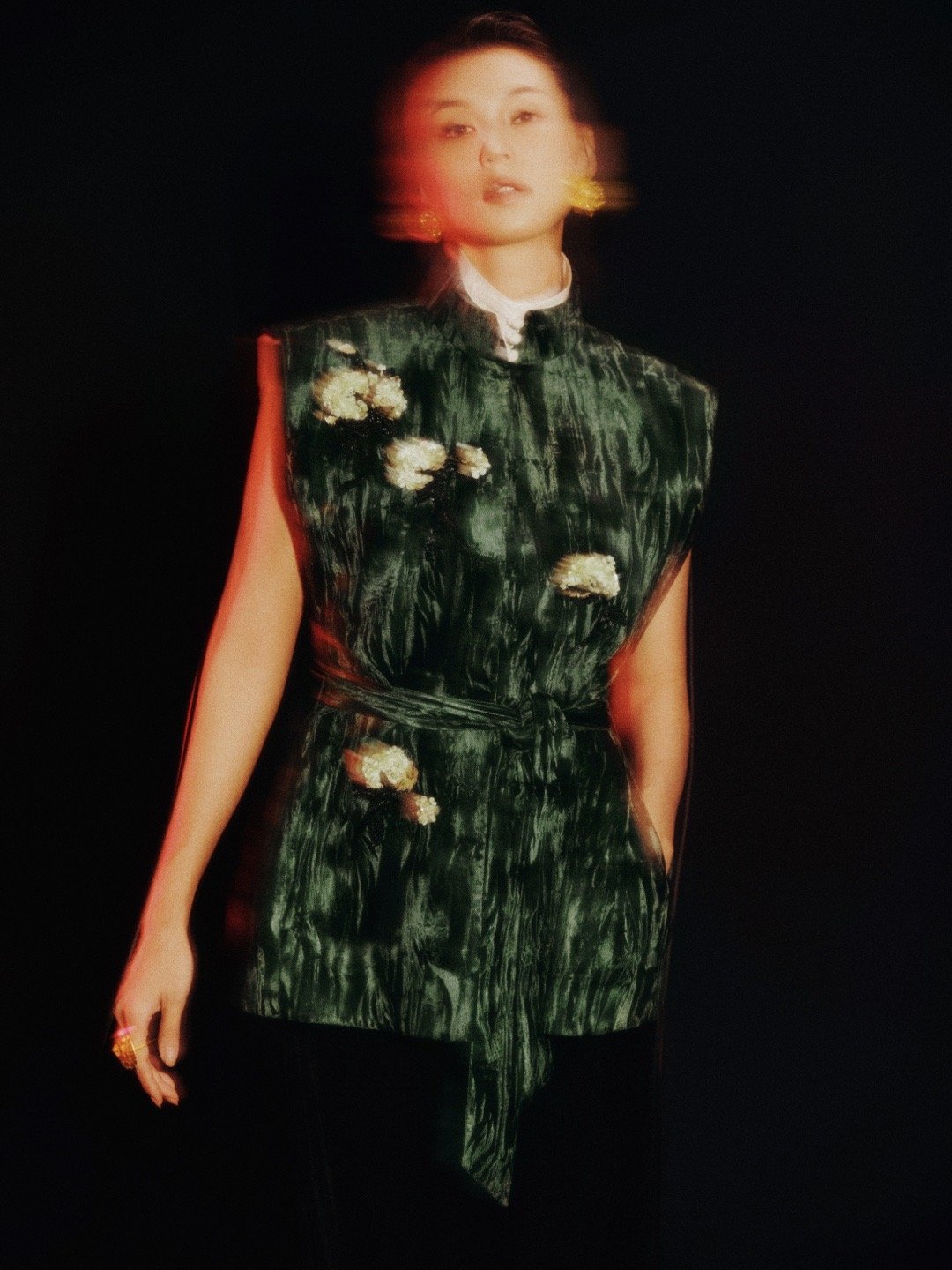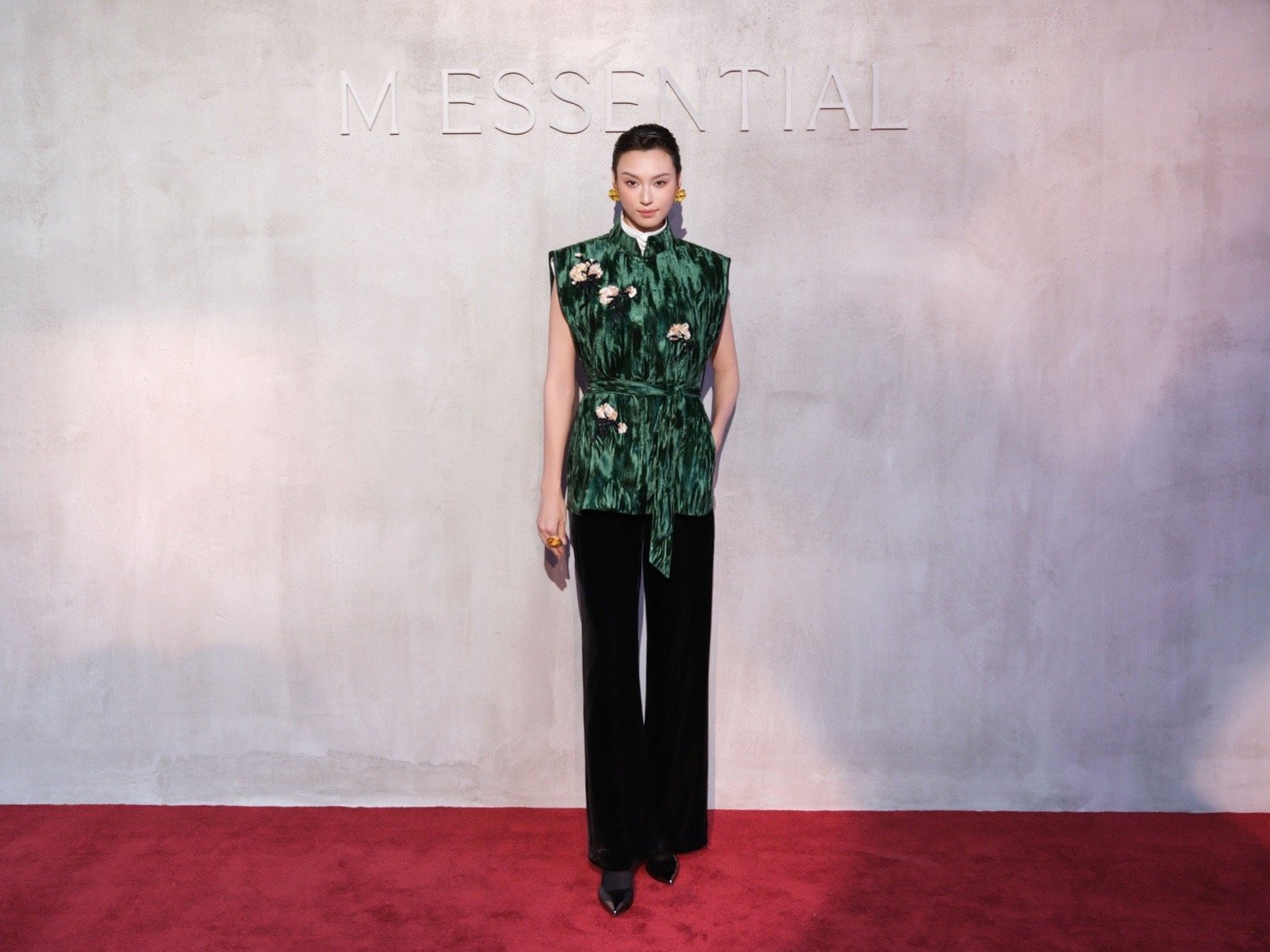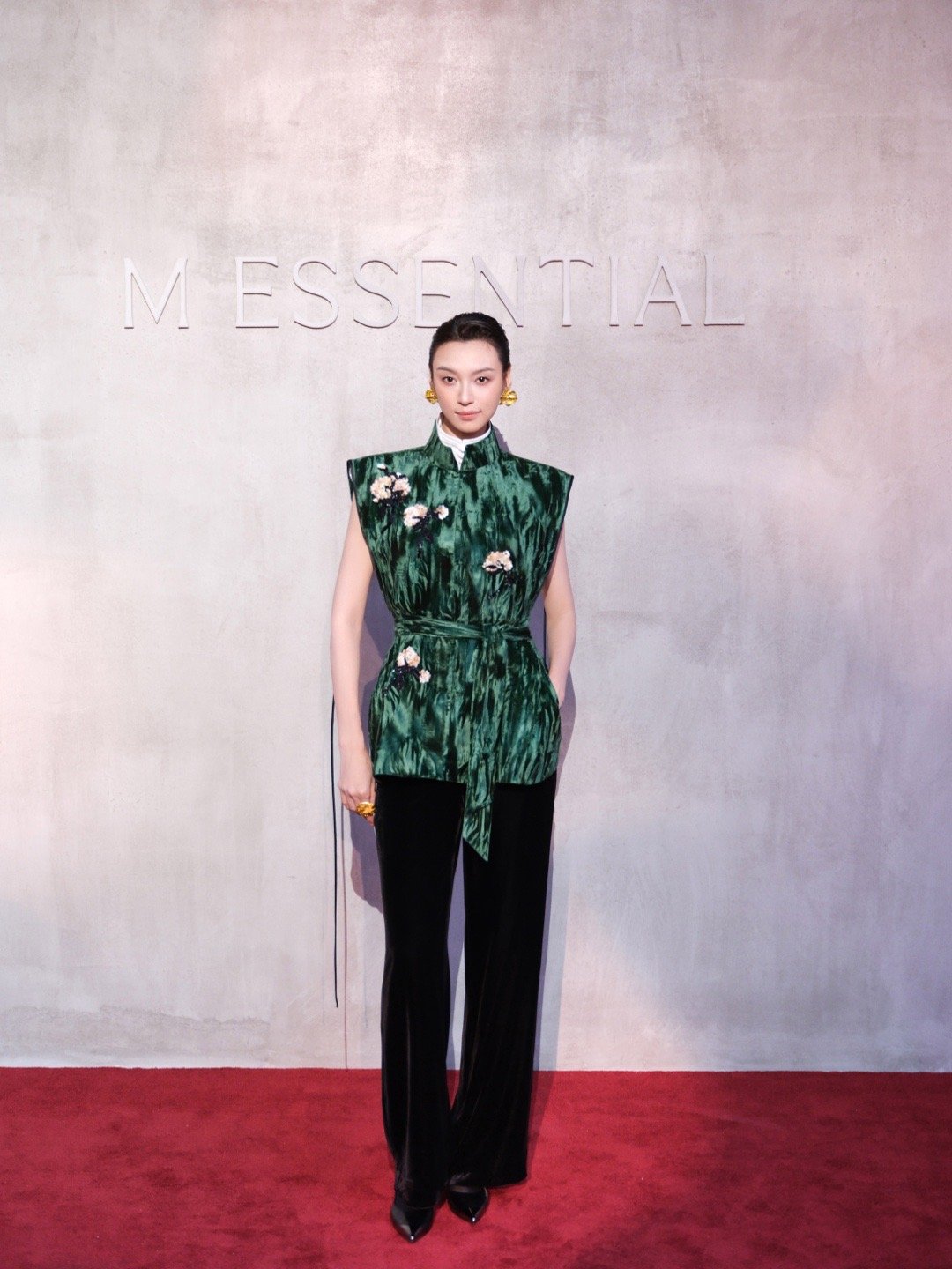 王丹妮今日亮相M ESSENTIAL大秀,一袭丁香钉珠刺绣丝绒阔肩马甲内搭白色盘扣衬衫,将高级感新中式拿捏得刚刚好。短发造型干净利落,衣上的立体花朵与耳饰的金属花瓣交织出别样东方韵味,绿色丝绒在灯光下折射光泽,充满力量又恰到好处的柔美。