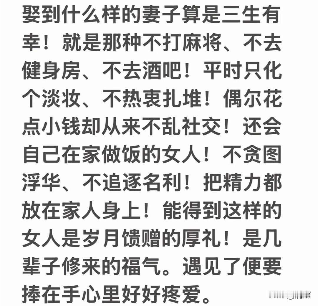 真的有这样的女人吗? 娶到什么样的妻子算是三生有幸! 就是那种不打麻将、不去健身房、不去酒吧! 平时只化个淡妆、不热衷扎堆! 偶尔花点小钱却从来不乱社交! 还会自己在家做饭的女人! 不贪图浮华、不追逐名利! 把精力都放在家人身上! 能得到这样的女人是岁月馈赠的厚礼!是几辈子修来的福气。 遇见了便要捧在手心里好好疼爱。 [泪奔]我老婆发给我的。她认真了。