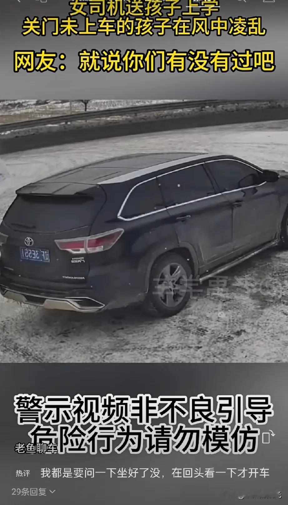 女司机送女儿上学,孩子还没上车她就一脚油门把车开走了…… 窗外大雪纷飞,寒风凛冽,女孩蹒跚着步伐走到车边打开车门一看没有座位,于是想走到左边上车,结果刚一关门车就开走了,她以为孩子上车了 要我说这女司机心真大!孩子坐没坐上车不回头看一下吗?后视镜也不看吗?留下孩子在寒风刺骨的雪地里无奈长叹! 网友:寒江孤影,江湖故人,相逢何必曾相识,但愿来生不再相遇……