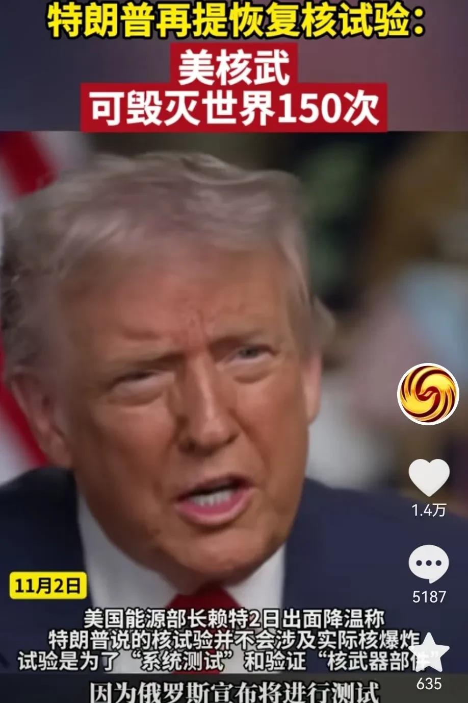 特朗普威胁全球人类,已经第三次提到核武器测试,难道他想做毁灭地球的事吗? 特朗普最近非常离谱,不断提核武器测试,他说俄罗斯,朝鲜,东方大国等国都在测试核武器,他们不能落后,也要进行测试。 特朗普这么做的目的也是对这些国家回应,也是秀肌肉,并且还说他们能毁灭地球150次,重点强调该事情,也是给全球人类一种威慑,意思是不要惹火他,不但全球被毁灭! #特朗普拿核武器威胁全球人类#