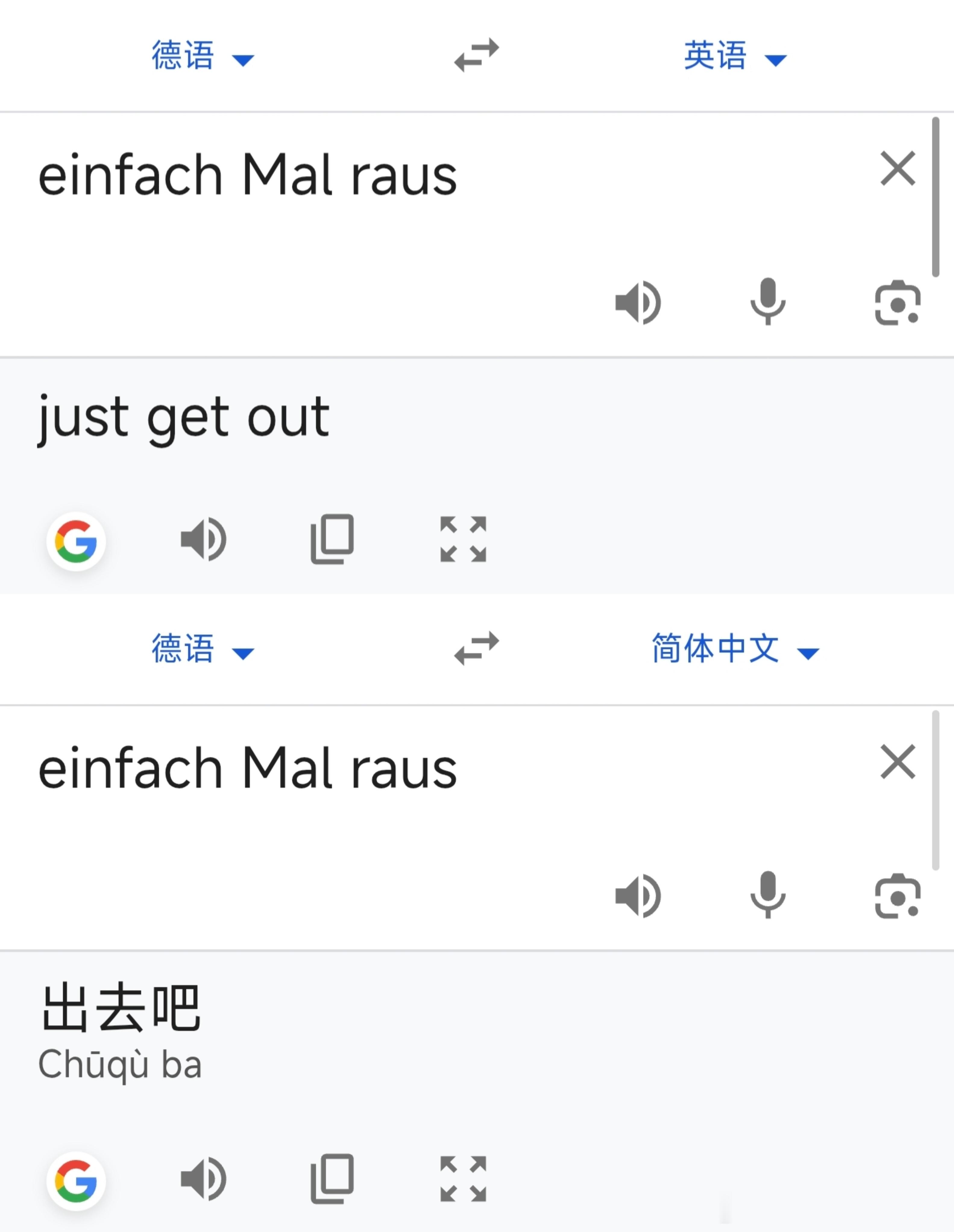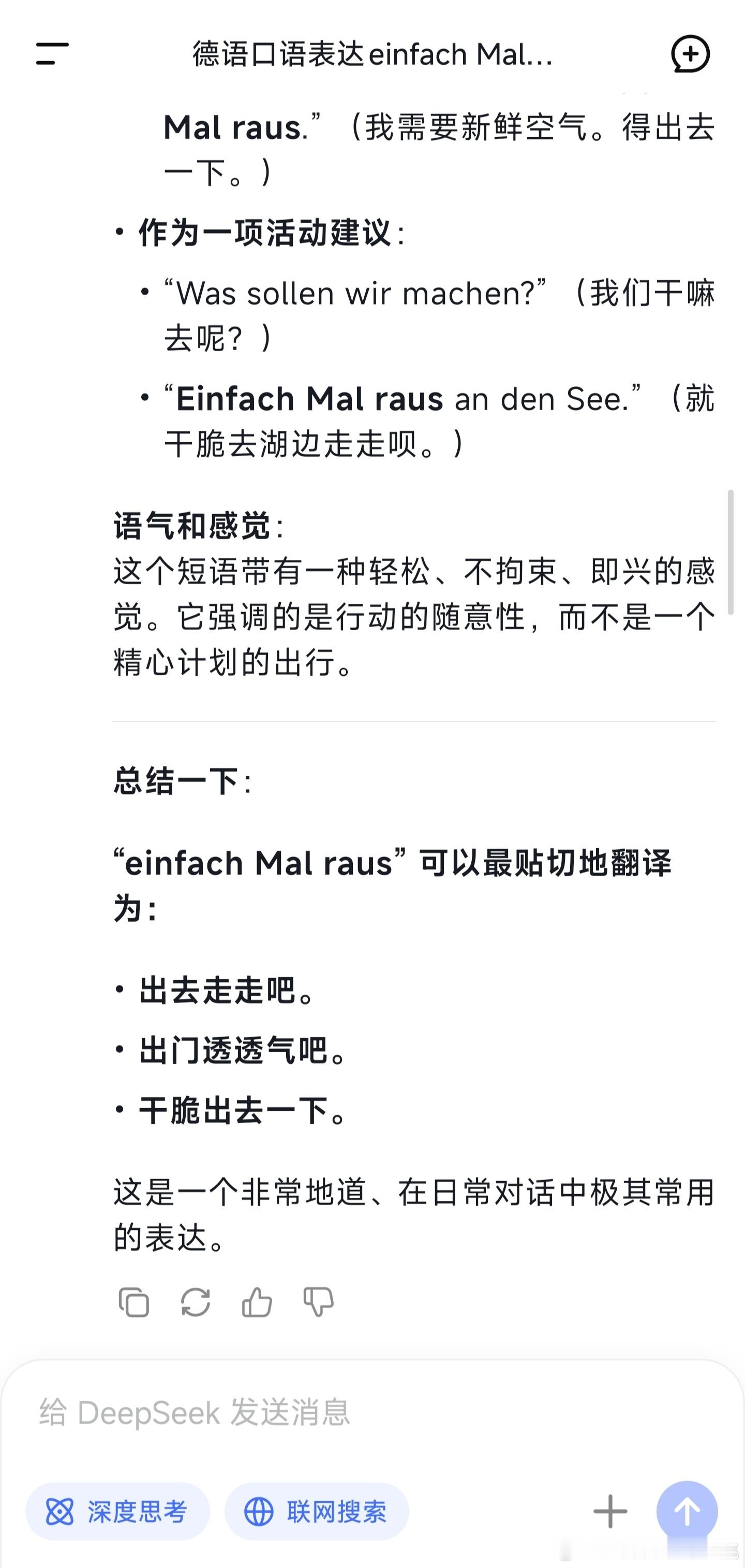 找来谷歌翻译试了下,德译英机翻还是老样子,不过德译中变成了“出去吧”。相较之下DeepSeek明显更加靠谱,一步到位翻译成了“出门透透气吧”这种口语化表达。