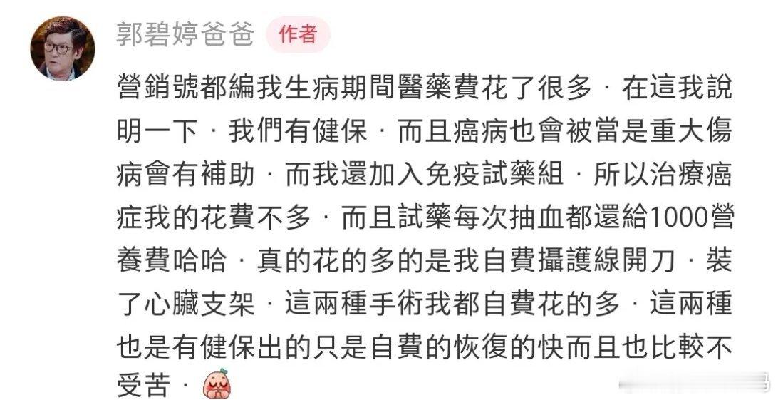 郭碧婷70岁的老父亲亲自辟谣啦:自己癌症治疗没花女儿太多钱,有健康保险,还加入免疫试药组,每次试药抽血有1000块营养费,除装心脏支架自费多些,其他都有补贴。