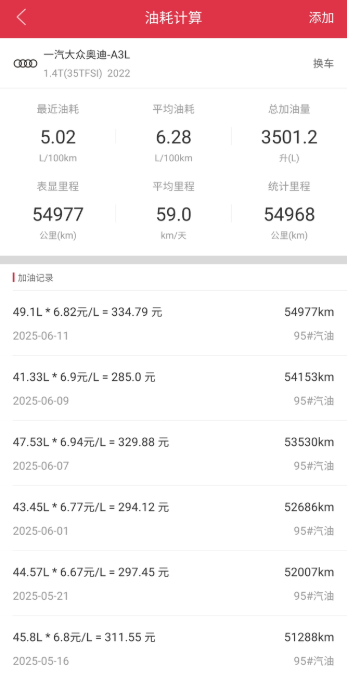 2022款奥迪A3L绝对是我开过所有机动车里最节油的一款,55000公里平均油耗6.28L,最近独库公路这一箱油也是达到了历史新低5.02L,追求“动力+经济”确实可以选。