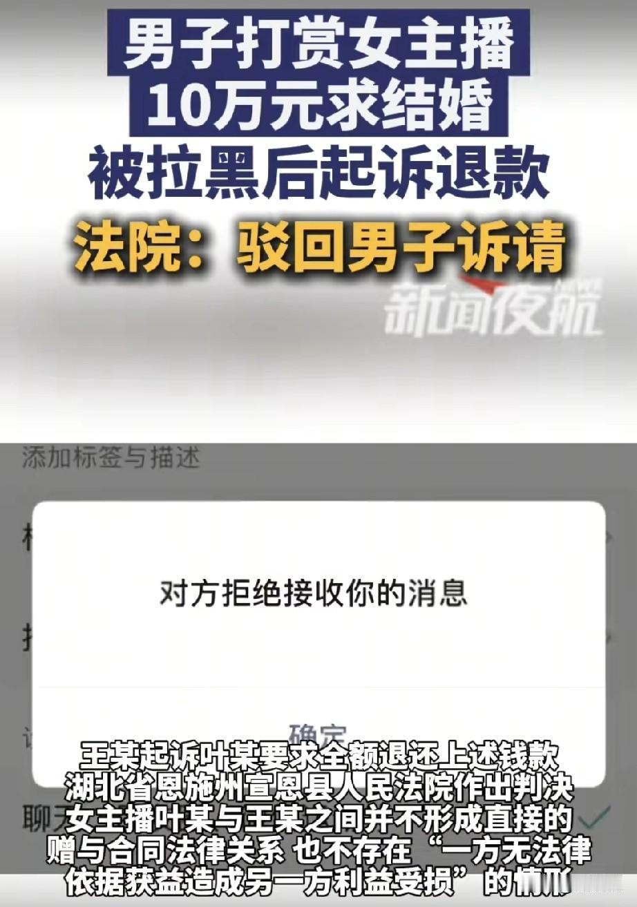 “太荒唐了!”58岁男子网络结识年轻女主播,短短58天内,通过网络打赏和赠送礼物为对方花费超10万元,一心盼着能和她结婚,当他满怀期待的提出见面商量婚事时,却遭遇对方拉黑,男子将主播告上法庭,要求返还全部花费,法院审理后认为,直播打赏是自愿行为,无逼迫性,并非不当得利,驳回了男子的诉求! 看到新闻就想到我朋友上个月也冲动打赏了一个主播,三天花了两万,后面人家直接不回消息。他后来去问律师,人家说打赏本质上是跟平台履行合约,除非有诈骗证据,不然基本拿不回来。
