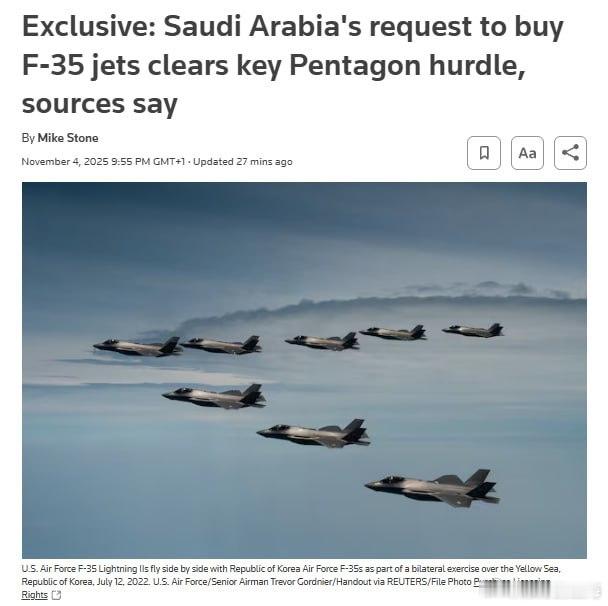 据路透社报道,沙特阿拉伯购买多达48架美国F-35战斗机的请求已通过五角大楼的关键审查,但仍需更高级别的批准。