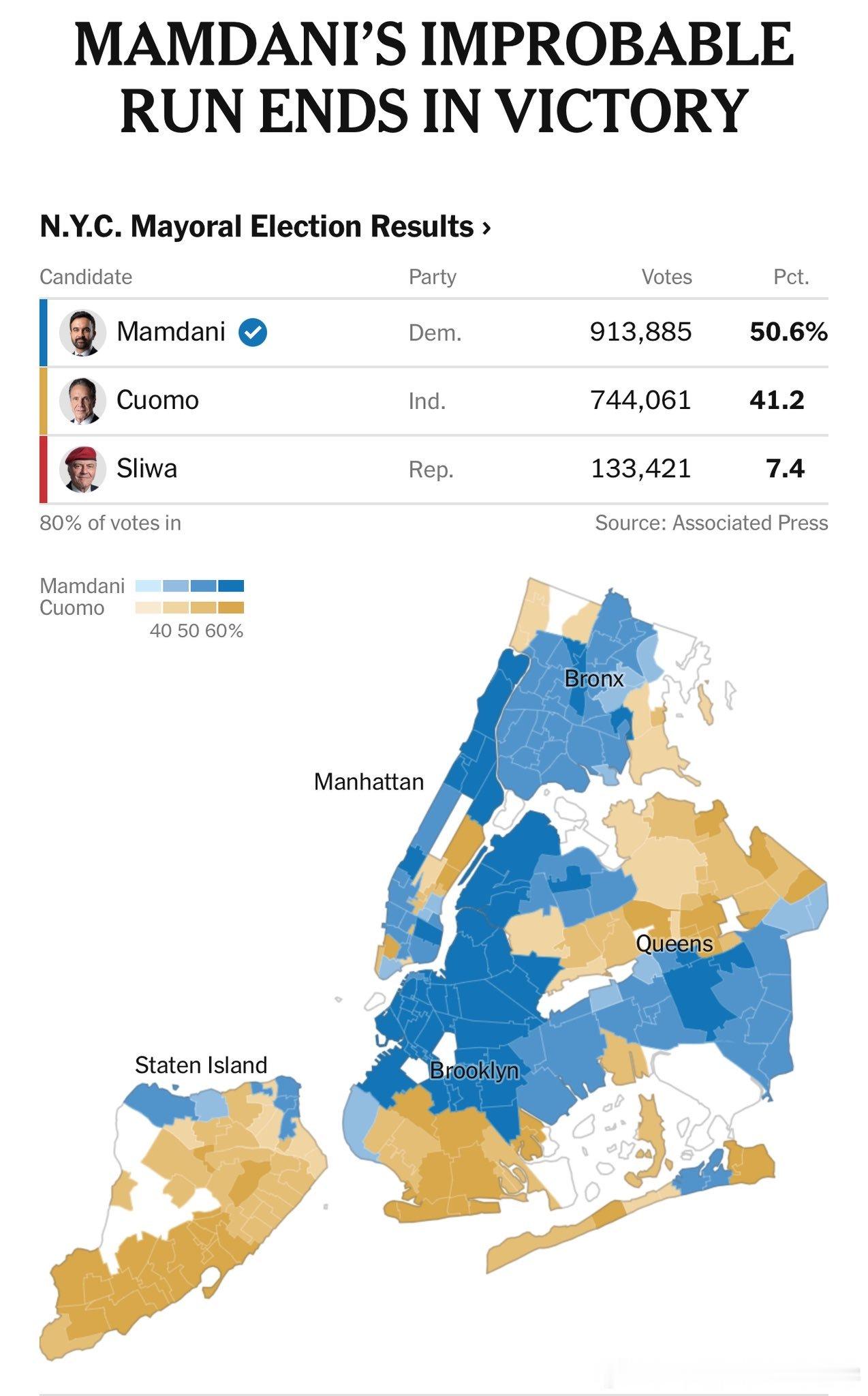 🟥尽管右翼和犹太复国主义者极力阻挠,尽管他们发动诽谤运动、砸下巨额资金,尽管有特朗普和美国首富埃隆·马斯克的威胁,扎赫兰·曼达尼依然赢得了纽约市长选举。