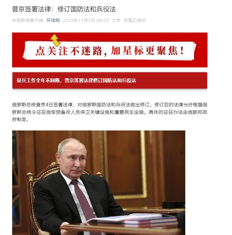 俄罗斯宣布了   11月4日,俄罗斯总统普京签署法律修订案,对国防法和兵役法作出重大调整,明确征兵工作将全年不间断开展,同时赋予总统直接征召预备役保卫关键设施的权限。这一系列动作,显然是对当前安全形势的直接回应。   这可不是俄罗斯突然瞎加码,早在10月26号就有苗头了。那时候俄政府就给议会递了个放宽预备役征召条件的法案,干脆把“得有武装冲突”“要往海外派兵”这些限制条款全删了。当时外界就猜,这八成是冲乌克兰的无人机来的,最近乌方的无人机跟串门似的,专挑俄罗斯的炼油厂、交通枢纽炸,根本不按常理出牌。   现在新法案一落地,俄总参谋部的解释直接印证了这个猜想:“我们正面临更大的威胁,必须把基础设施的防护搞扎实”。这话可不是没根据的,就说2025年刚过去俩月,俄罗斯四大炼油厂里头的梁赞炼油厂,就被乌克兰的无人机连着炸了三回。   这厂子一年能炼1370万吨石油,占了俄全国炼油总量的5%,专门产柴油和飞机用的喷气燃料,真要是被炸瘫痪了,前线的后勤补给和国内老百姓的生活都得受影响。这种节骨眼上,俄罗斯哪儿还能按老规矩搞“季节性征兵”,全年都保持征兵状态,才能随时补上人手。   不过有个关键点得掰扯明白,别一听见“扩兵”就往俄乌战场上扯。俄总参谋部特意说明白了,这次征的预备役,绝对不会派去乌克兰战场,任务就一个,看好自家的关键设施。其实之前俄罗斯春秋征兵也一直是这个规矩,2025年春天计划征16万人,秋天13.5万人,新兵全在俄境内的驻地训练,连顿涅茨克、卢甘斯克这些有争议的地方都不去,更别说乌克兰本土了。   这次调整的核心,说白了就是“把防守扎结实”。以前征预备役,得等“发生武装冲突”这种大事才行,现在不用等了,只要关键设施有危险,总统一句话就能调人。而且新法案里说的预备役也不是随便拉壮丁,都是跟国防部签过合同、定期训练的“熟手”,召过来就能用,不用花大功夫从头教。毕竟无人机袭击来得快,等走完老一套征召流程,目标早被炸成筛子了。   对比之前的征兵模式,这次“全年不间断”也有讲究。过去像北极那些气候特殊的地方,只在秋天征兵,现在虽说全年征兵,但这些特殊区域的安排估计还会灵活调整,不会硬卡时间。预备役的任务范围也拎得很清,就是盯着那些容易被无人机盯上的目标,炼油厂、输油管道、铁路枢纽这些“经济命脉”,把防御网织得更密。   说到底,俄罗斯这波操作是“对着威胁搞防御”,不是要扩大战事。乌克兰的无人机越境搞袭扰越来越频繁,不管是炼油厂还是交通设施,打的都是俄罗斯后勤和民生的软肋。新法案就相当于给这些关键设施装了“移动盾牌”,用专业的预备役部队替换临时调过来的作战兵力,既守住了本土安全,又不耽误前线的兵力部署,算是把资源用在了刀刃上。   外界可能会有各种乱七八糟的解读,但从法案细节和官方说法来看,俄罗斯的思路很清楚:不管战场形势怎么变,本土安全永远是底线。全年征兵是为了让兵力储备不断档,征预备役守设施是为了堵上防御漏洞,每一步都踩着实际威胁的节奏来,没半分虚头巴脑的东西。