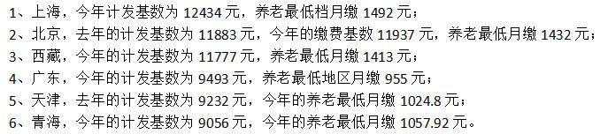 2025年养老金计发基数超过9000元的省市,其缴费压力其实也不小。 虽然截止目前还有9个省市没有公开今年的养老金计发基数,但是根据已经公开及结合去年的情况,以下的省市计发基数虽然超过9000元,但是其对应的灵活就业缴费压力不小。 1、上海,今年计发基数为12434元,养老最低档月缴1492元; 2、北京,去年的计发基数为11883元,今年的缴费基数11937元,养老最低月缴1432元; 3、西藏,今年的计发基数为11777元,养老最低月缴1413元; 4、广东,今年的计发基数为9493元,养老最低地区月缴955元; 5、天津,去年的计发基数为9232元,今年的养老最低月缴1024.8元; 6、青海,今年的计发基数为9056元,今年的养老最低月缴1057.92元。 也就是说,至少有以上6个省市今年的养老金计发基数在9000元以上。其中,广东省最低的地市月缴灵活就业养老费约955元,其余省市的养老月缴费都在1000元以上,最高的是上海为1492元。