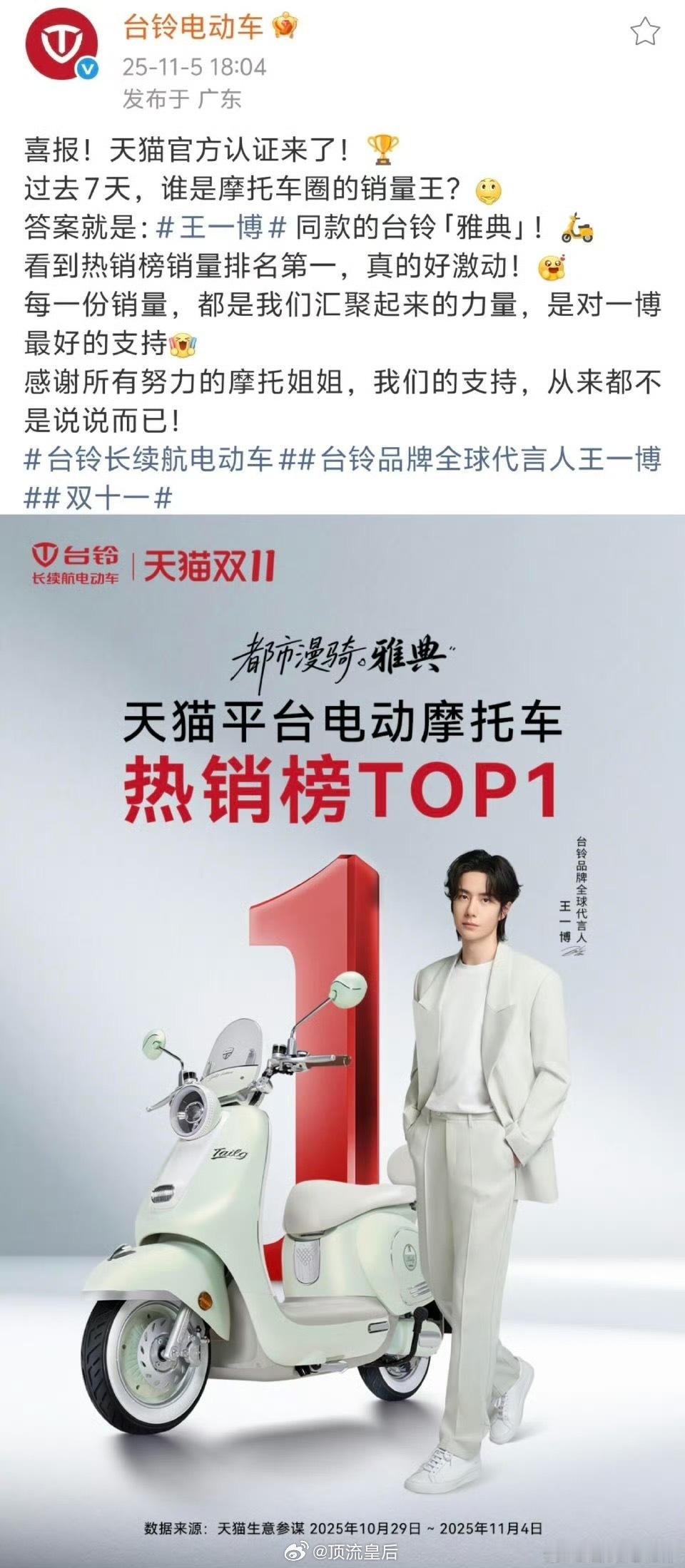王一博代言台铃电动车三年了还有战报,这带货能力没谁了。[赞]