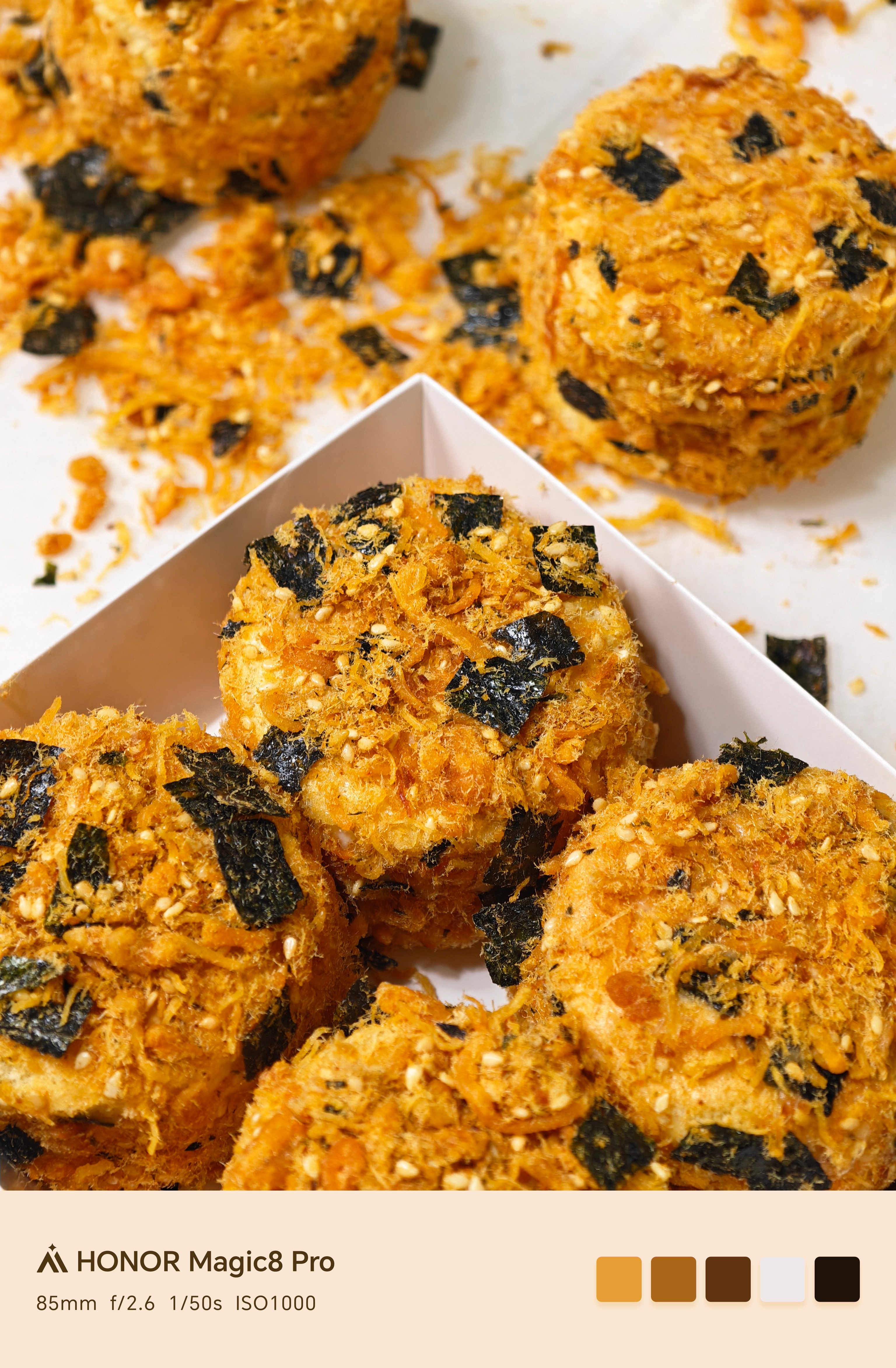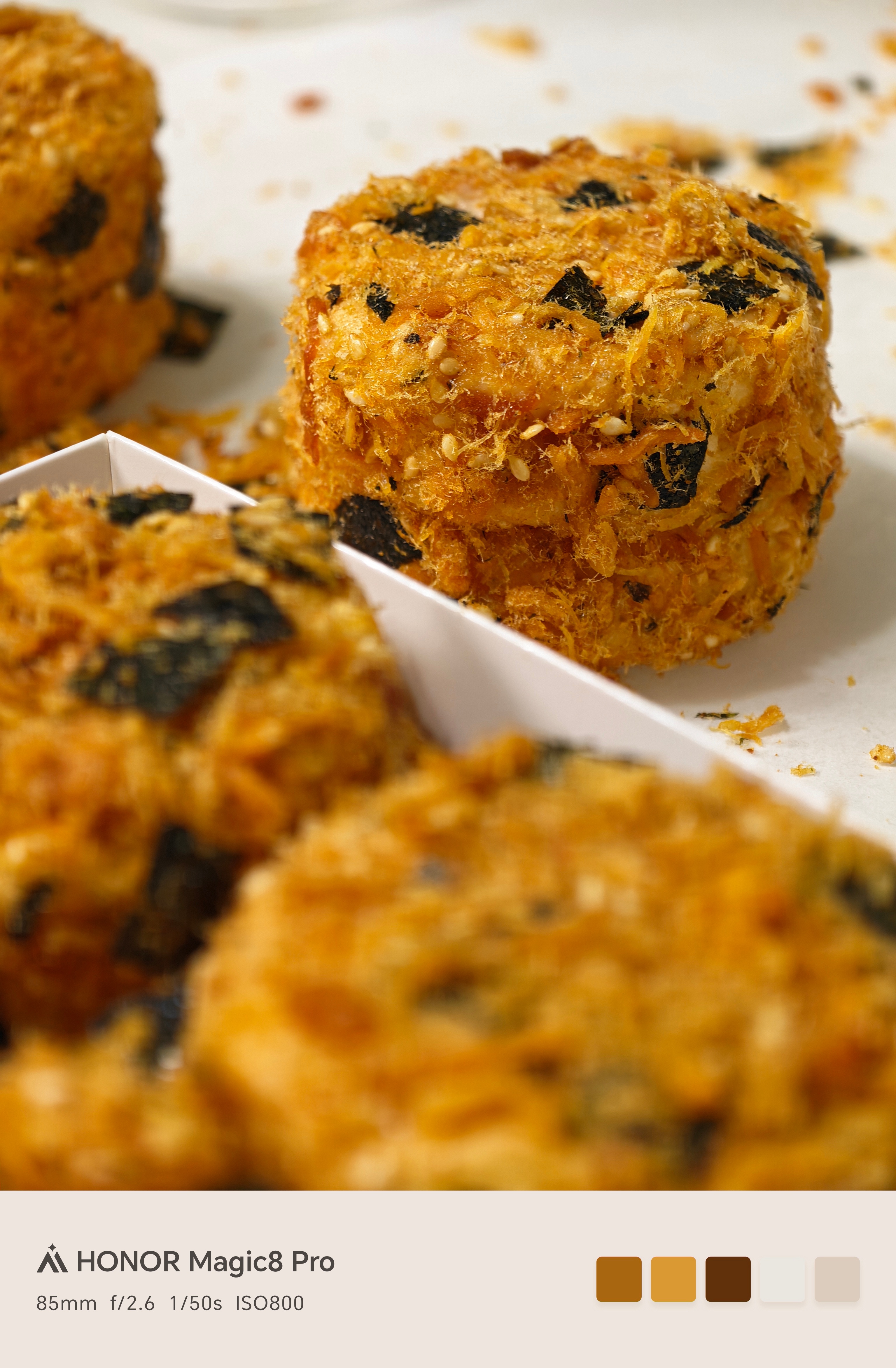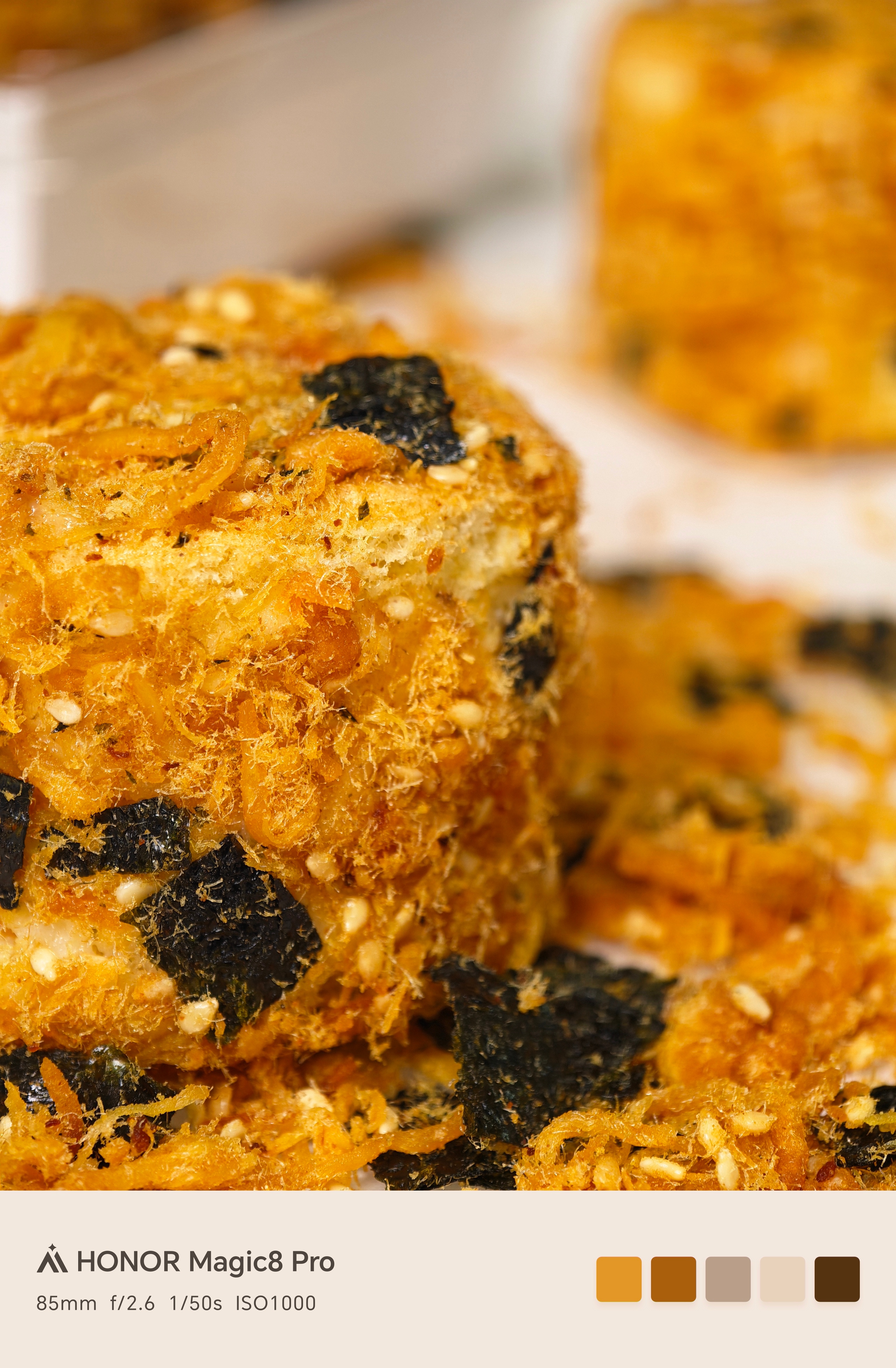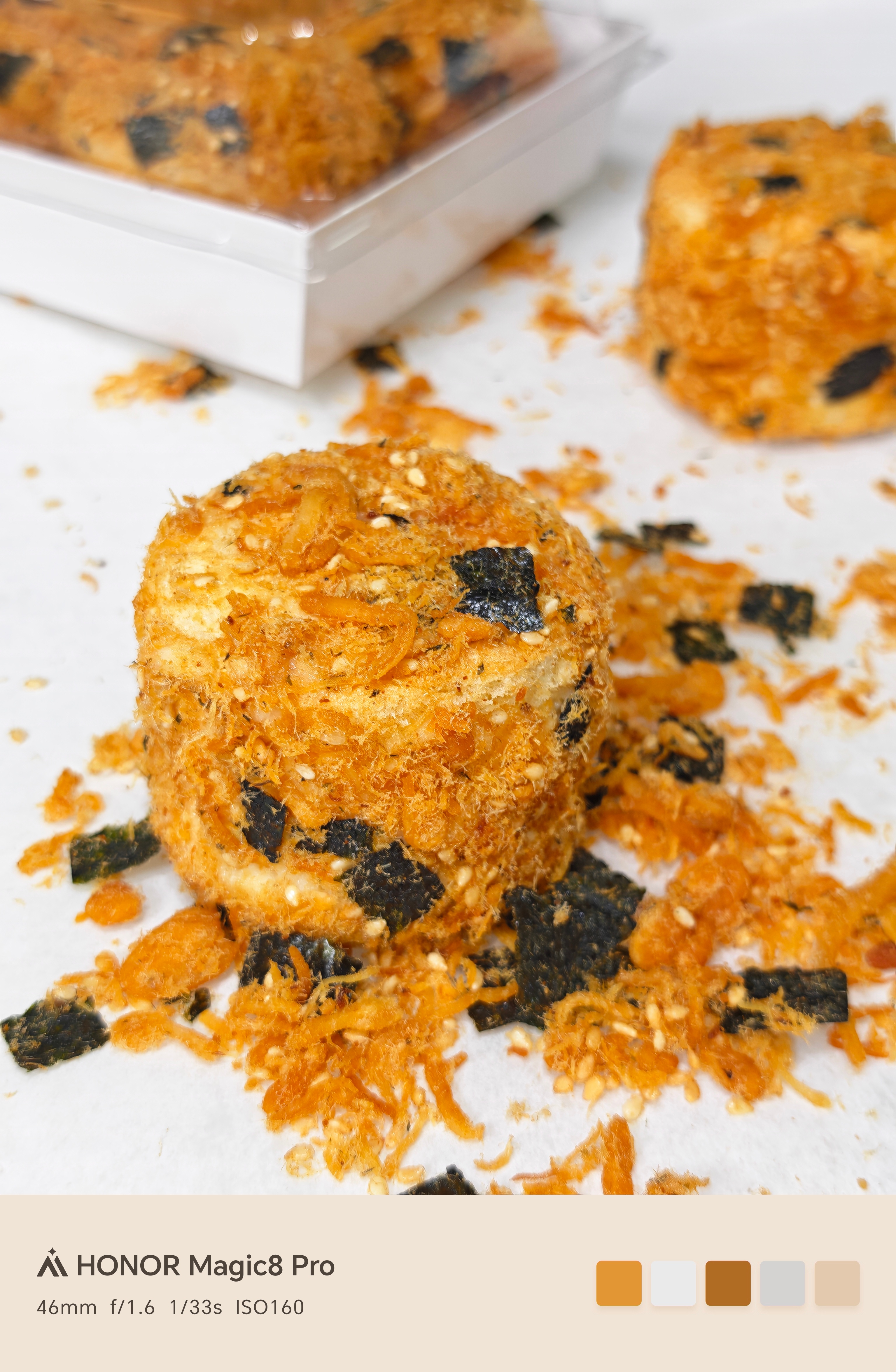 既然云层挡住了超级月亮,确实拍不到了,那就先拍我们自己刚做好的肉松小贝吧。荣耀Magic8 Pro的影像力到底好不好,你们自己看,我肯定是满意的。