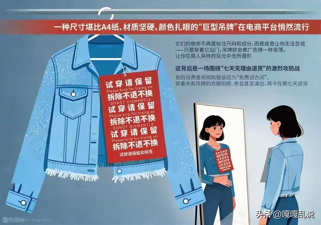 双十一女装圈的“巨型吊牌”也太魔幻了!A4纸大小的硬壳吊牌拦得住恶意退货,却遮不住行业的尴尬本质。 女装退货率飙到50%-60%,直播退货更是超80%,商家被逼出这招实在无奈——毕竟有学生穿完运动会、表演服就集体退货,让小店直接倒闭。 但这根本不是根治之法,高退货率一半怪“白嫖党”滥用规则,一半也怨商家:尺码越做越小搞“白瘦幼”营销,卖家秀P图过度,实物和图片差得离谱。 现在《反不正当竞争法》都把恶意退货列为违规了,平台也该跟上。 与其让商家靠吊牌被动防御,不如统一尺码标准、严查虚假宣传,再拉黑高风险退货账号。 毕竟良性市场靠的不是互相提防,而是商家守诚信、消费者讲规矩。 你觉得除了巨型吊牌,还有啥办法能平衡商家和消费者的权益?网购女装退货率