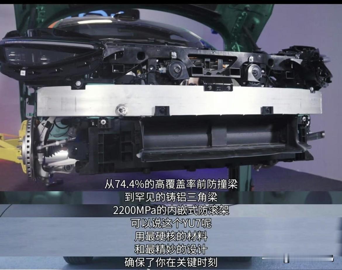 易车把小米yu7整个从里到外拆了一个遍,大家最关心的车身安全和电池安全都有了结论(不愿意看数据的拉到底看最后)。 车身: 1、前防撞梁:铝合金材质、标准目字形横截面、厚度十分足实、1484毫米、覆盖率74.4%。 2、A柱:2200兆帕热气胀工艺;内嵌防滚架:超强钢内嵌A、B柱内侧(最硬核的材料)。面对顶压和钻卡可以更好的保护车内乘员安全。 3、丢轮保命:A柱下方有一斜面设计,当轮圈遭受严重碰撞要脱开底盘的时候会和该区域接触,而轮圈接触到斜面设计就会被拖走,实现丢轮保命。 电池: 1、电池防护:有四根横梁,2根1500兆帕、2根2000兆帕强度、加上后地板大铸件横梁均匀分布。电池包前端还有一个防挂底横梁,1500兆帕、相当于电池包的防撞梁。 2、14层电池防护:顶部支撑3层、侧碰支撑3层、底部防护8层,最接近地面部分还有防弹涂层。还有高压绝缘防护有17层。 其实最打动我的还是真实的案例,某地泥头车逆行导致多车连撞,一辆小米yu7遭遇180°旋转推行➕夹击,最后A、B柱都没变形,车门正常开启,车主直接说“救了我一命”……