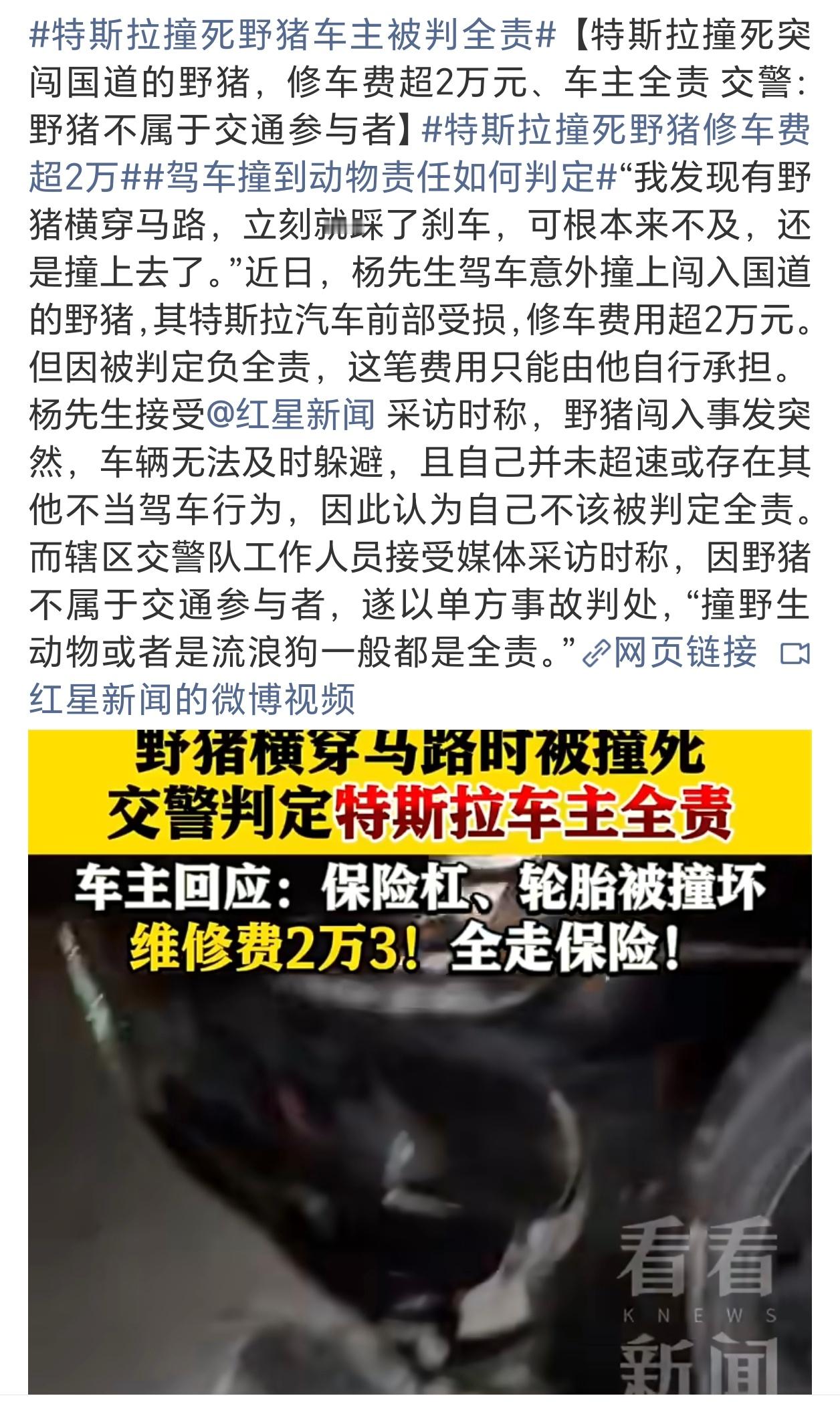 特斯拉撞死野猪车主被判全责理解一下,毕竟野猪没买保险,而车子有……
