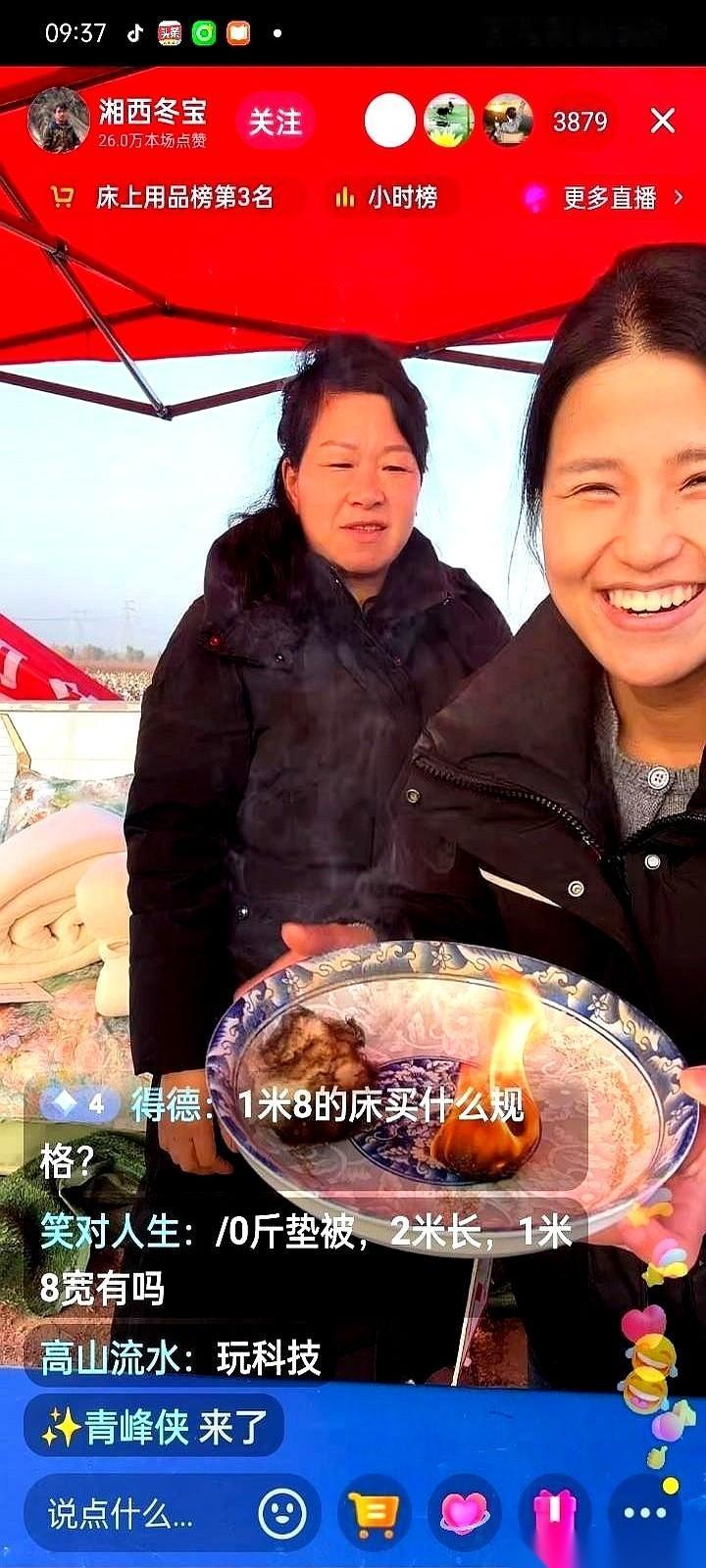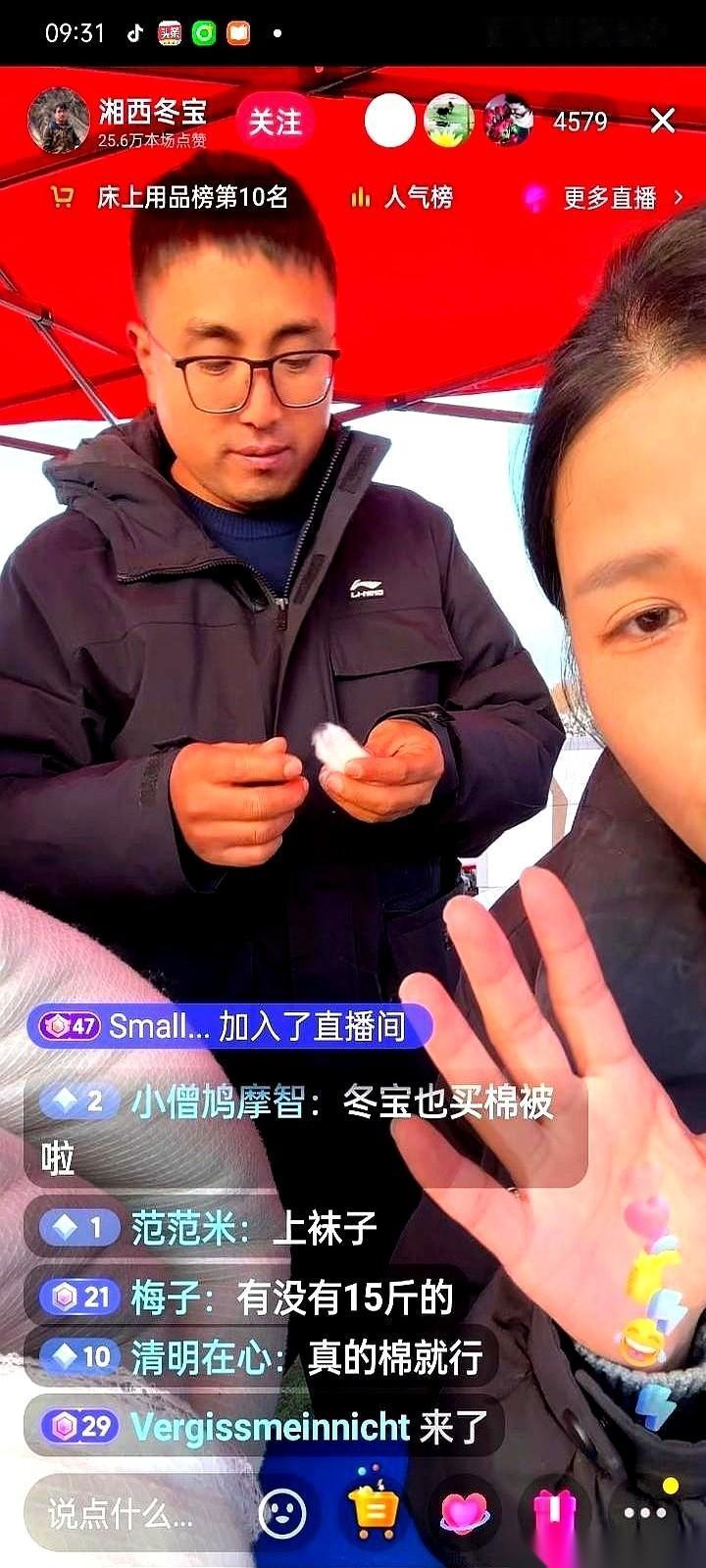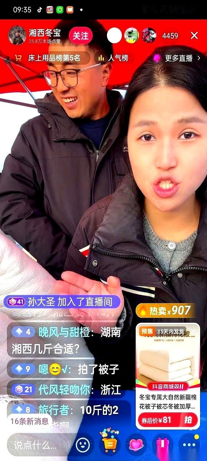 一晚上卖了一千多床新疆棉花被。 但你信不信,那个叫冬宝、傻乎乎站着的小伙,才是真正的“货”。 他媳妇儿,刘薇,那嘴皮子简直了,一个人就是一支军队,谁敢说她男人一句不好,她能立马给你怼回去。 而他呢? 他就负责站在那儿,有点不好意思地笑一笑。 齐活了。 最绝的是后面那个丈母娘。 那才是真正的操盘手。 一会儿举牌子,一会儿点火烧棉花,用最笨的法子证明这玩意儿是真的。 那股又拼又有点笨拙的劲儿,就怕女儿女婿在外面受了委屈。 你以为直播间那四千多人,真是冲着被子去的? 别傻了。 大家买的,是那个“老实人就该有媳妇儿疼”的故事。 买的,是“一家人拧成一股绳,用力生活”的感动。 说白了,是为自己心里那点儿对纯粹感情、对好日子的盼头,真金白银地投了一票。 产品是棉被不假。 但卖点,是人心。 人家把日子演成了连续剧,咱们呢,心甘情愿掏钱当VIP,追更。 这生意,做得高明。