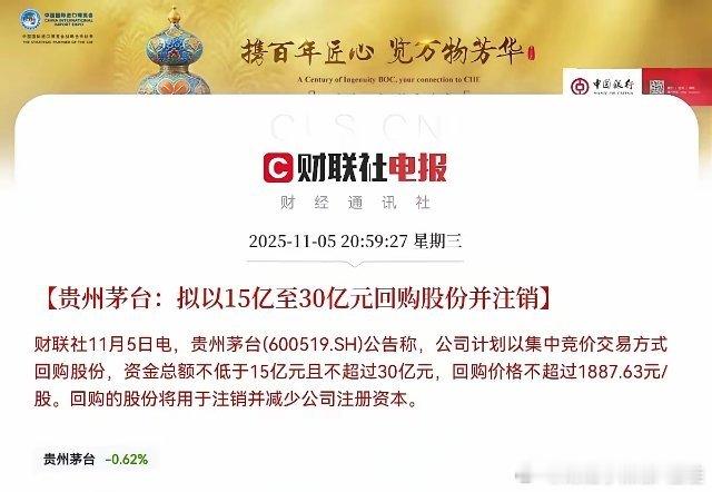 晚间8点59分,贵州茅台发布公告称,公司将计划以集中竞价交易方式回购15亿至30亿股份,并全部注销,回购价格不超过1887.63元/股,此利好消息一出,股民们是激动万分,太给力了,这对于贵州茅台的股价来说是重大利好,在公司最艰难的时候,关键时刻贵州茅台管理层能果断出击,积极维护公司股价,维护中小投资者的利益,给长期投资者带来了信心,这值得点赞,这就是好公司,值得市场上很多公司学习