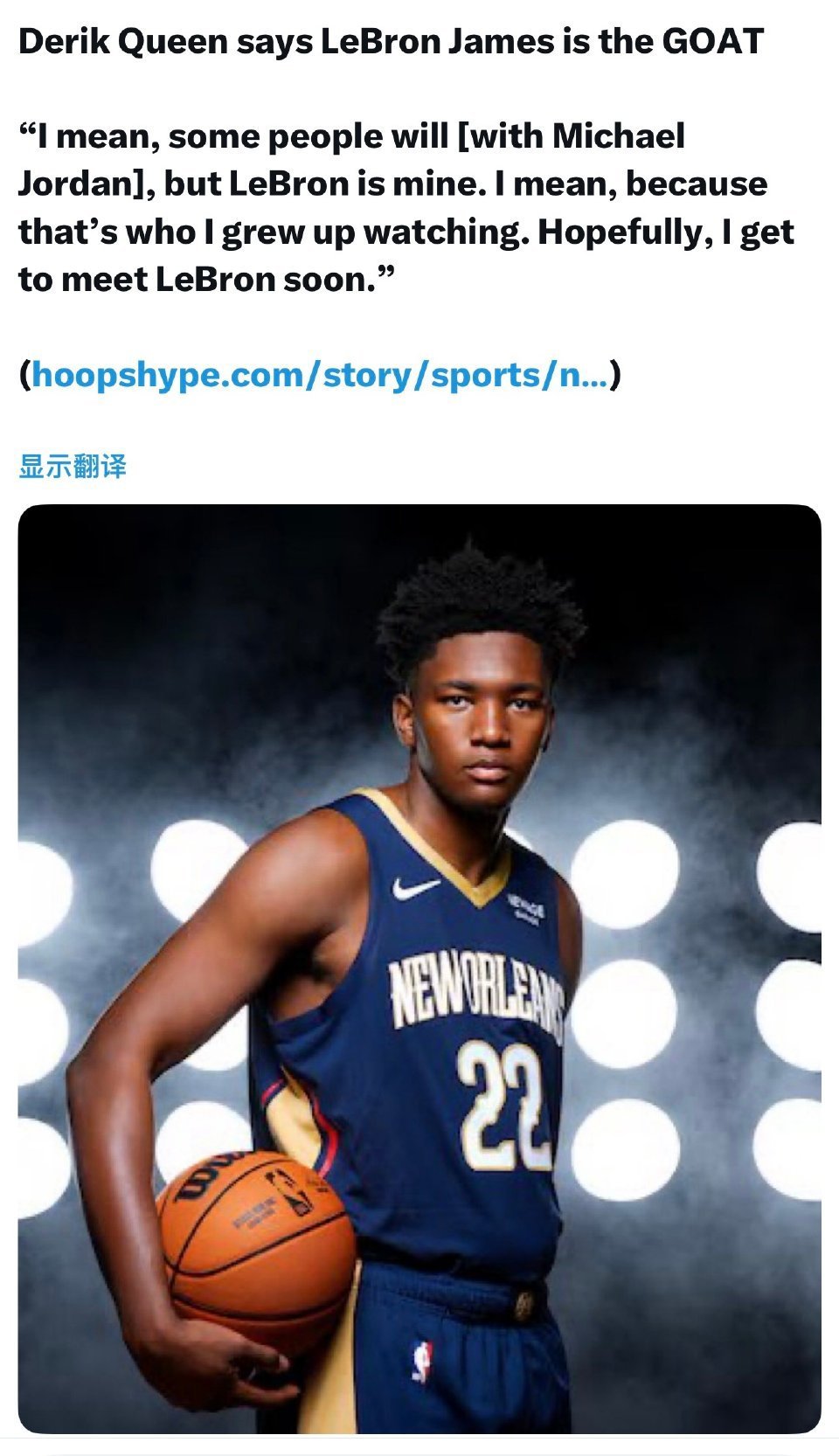 鹈鹕新秀德里克-奎因:有些人会说乔丹,但我的goat是勒布朗-詹姆斯!我看他打球长大的,希望有机会能见到他本人。