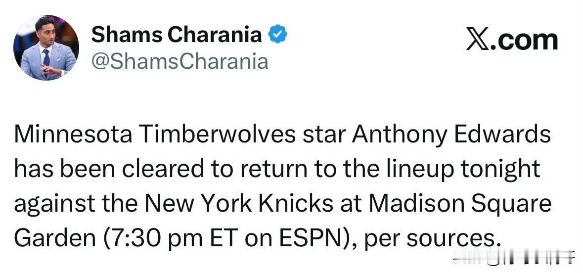 华子复出了!!!爱德华兹在今天对阵尼克斯的比赛中复出! 根据记者Shams最新消息透露,北京时间11月6日上午八点半,森林狼将做客纽约挑战尼克斯队,本场比赛森林狼当家球星爱德华兹将迎来复出。 华子这也太强了吧,这腿筋伤病不得恢复个两周,这也就一周华子复出了,年轻就是资本,伤病恢复也快,不过华子还是应该慎重,毕竟他的职业生涯还很漫长。 作为森林狼当家球星,没有华子在球队还是少了主心骨,森林狼目前在西部只排在第七名,兰德尔独自带队肯定没有华子硬解能力更强一些。 恭喜爱德华兹恢复健康,森林狼新赛季继续加油,他们的阵容看似不错,但是控卫上还是需要加强。 爱德华兹森林狼 狼王爱德华兹 森林狼 爱德华兹