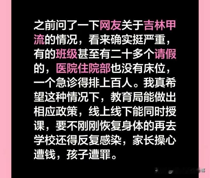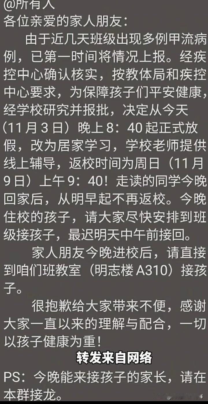 说实话,你那里出现甲流了吗? 昨天和远在东北的前同事打电话得知,她家的孩子已经好几天没去学校了…… 因为她孩子班级里感染甲流的学生接二连三的请假,她怕自己孩子也被传染了,只能先让孩子回家待几天避一避。 今年流行的甲流病毒和去年的病毒居然还不是一个类型,不过这次得了甲流后,还是和之前差不多的症状。 刀片嗓、高烧不退、浑身无力等,这些症状只有经历过的人,才知道有多难受! 同事还告诉我,她孩子的同学有几个刚症状减轻回去学校以后,却又重新有了感染甲流的症状。 也不知道是没治好又反复了,还是回去学校以后又被感染,同事怕自己孩子也中招,赶紧向老师请假不让孩子去学校了。 同事说自从羊过以后啊,她也看开了,学习啊工作啊再怎么样,真不如有个健康的好身体。 所以她这次就决定了,哪怕孩子学习因此退步了,她也认了,只要孩子好好的,比什么都重要。