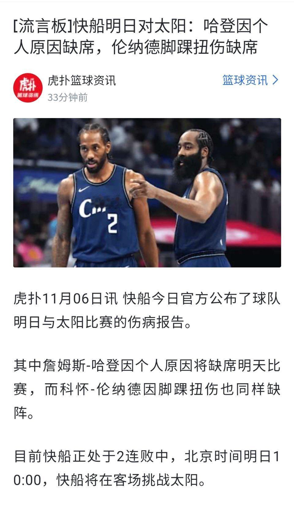 快船这是要💥的节奏???明日对阵太阳:詹姆斯-哈登因个人原因缺席比赛,伦纳德脚踝扭伤继续不打……