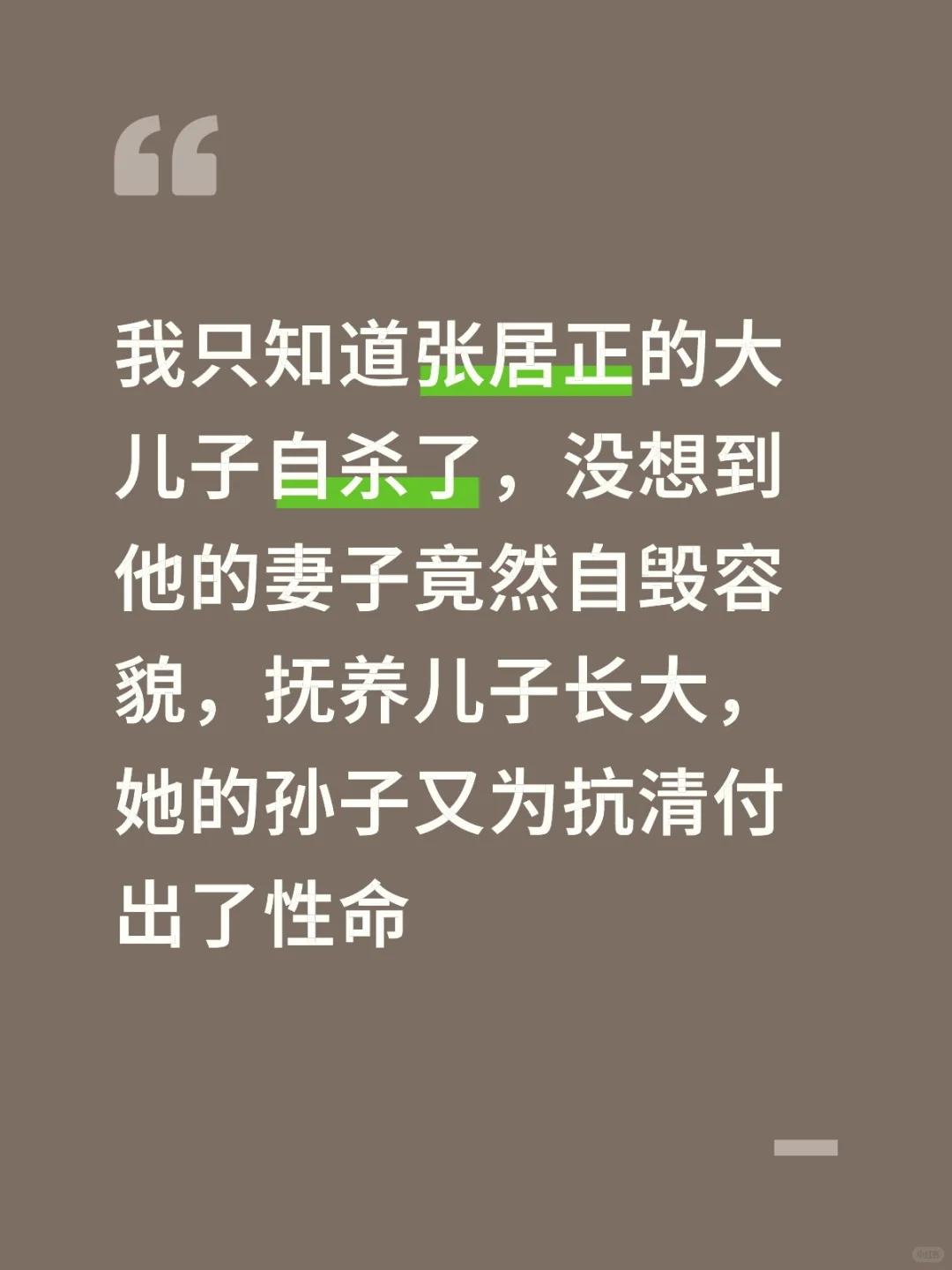 张居正家族的结局太让人唏嘘了😭 一直只知道他大儿子被逼自杀的悲剧 没想到他妻子高氏更让人敬佩到心疼! 张居正,他是大明王朝的 “救火宰相”,推行一条鞭法、整顿吏治、疏通漕运、加固边防 硬生生为大明续了近百年国运 张居正一生鞠躬尽瘁辅佐万历 把他当亲儿子般呕心沥血教导 可最后伤他最深、抄他家的 偏偏是这个他倾注所有心血的“神似儿子”的帝王抄家毁誉,伤得最深最彻底 而真正守住家族风骨的,是他的妻儿后代 他的儿子们个个有气节,孙子更是忠烈 丈夫死后家族遭清算,高氏铁骨铮铮,自毁容貌明志 独自扛下所有苦难,拼尽全力抚养幼子长大 更让人感慨的是,他的孙子长大后,毅然投身抗清战场用性命保卫大明河山,践行了祖辈的忠烈❤️ 不知道高氏在九泉之下回望这一切 会是欣慰,还是遗憾呢…