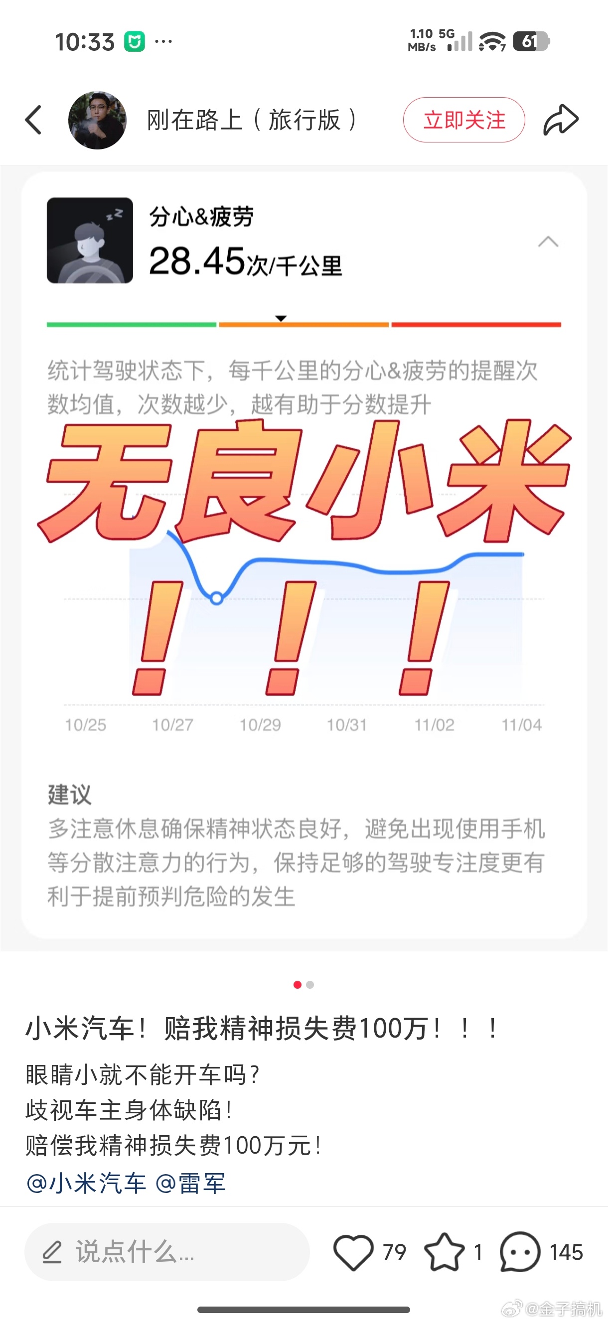 艹,小米汽车车主也下场开始薅百补的羊毛了…[流鼻血][流鼻血]不过,眼睛小被识别成疲劳驾驶确实是个问题,希望小米好好识别一下,最好是提供个眼睛录入,比如请睁大眼睛,这样针对特定的人群,避免识别不准的问题…貌似,其他车也有这种情况…[允悲][允悲]