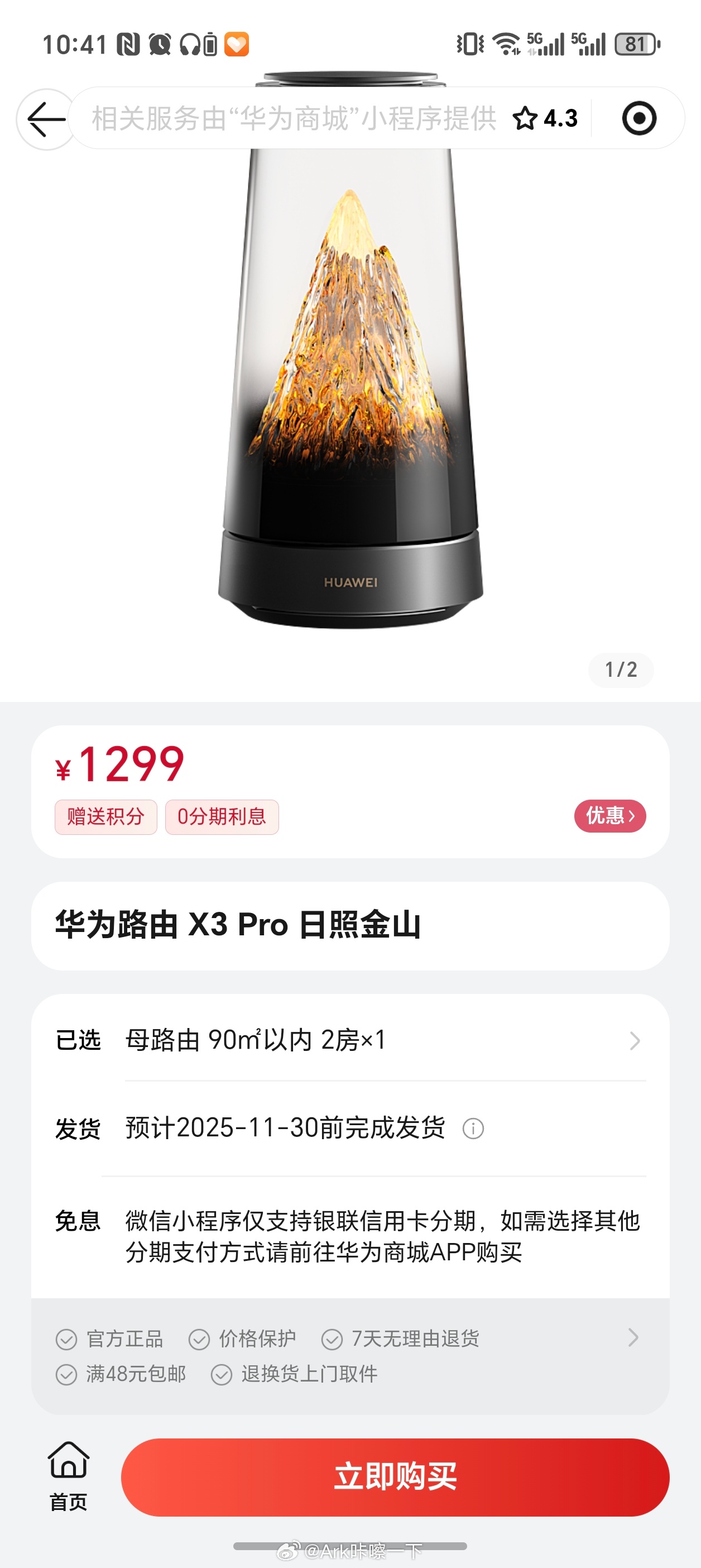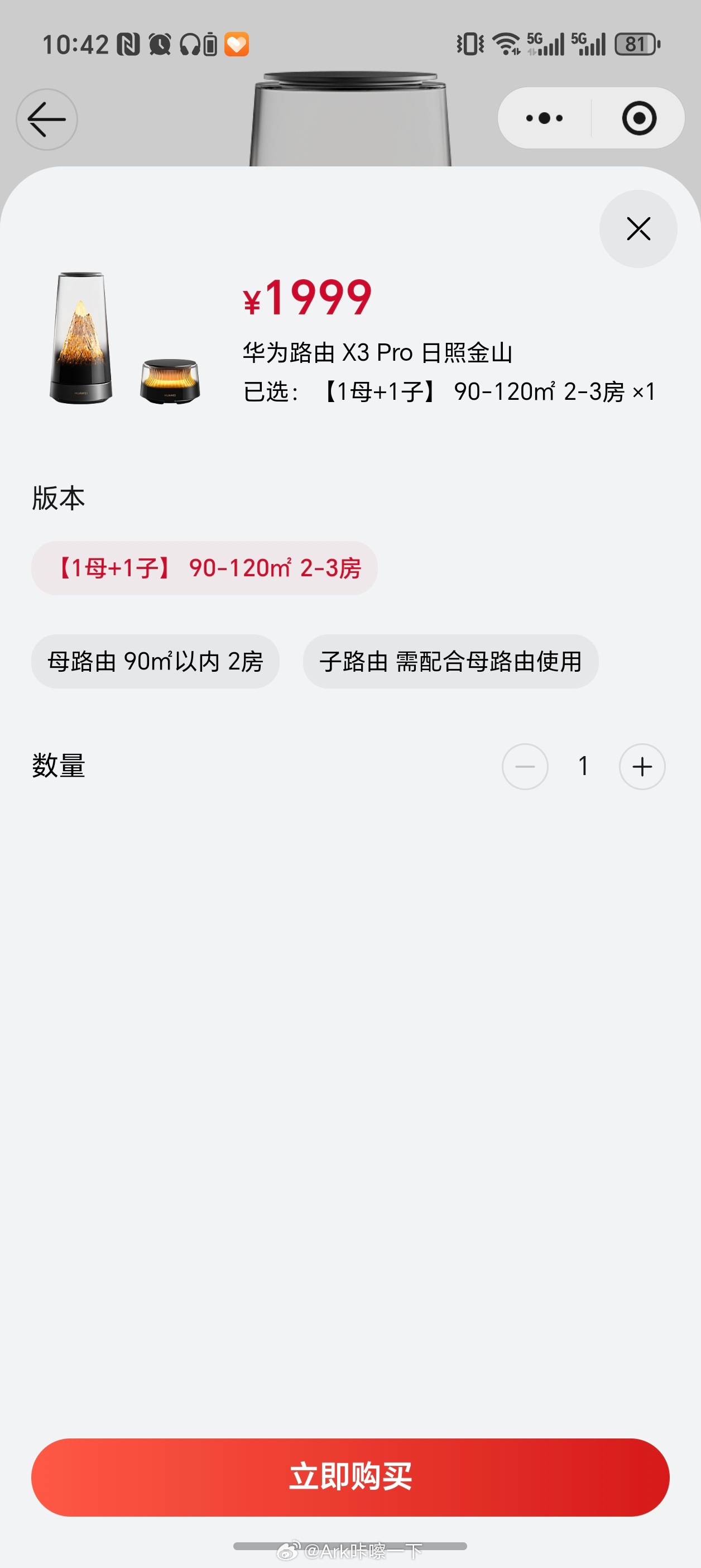 还猜对了,华为路由X3 Pro日照金山子母套装1999元,我之前猜的超过1500,单买一个母路由是1299元,你会买吗[柯基]有点东西新品驾到