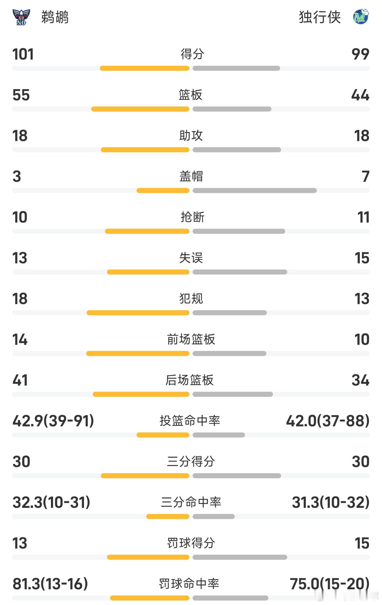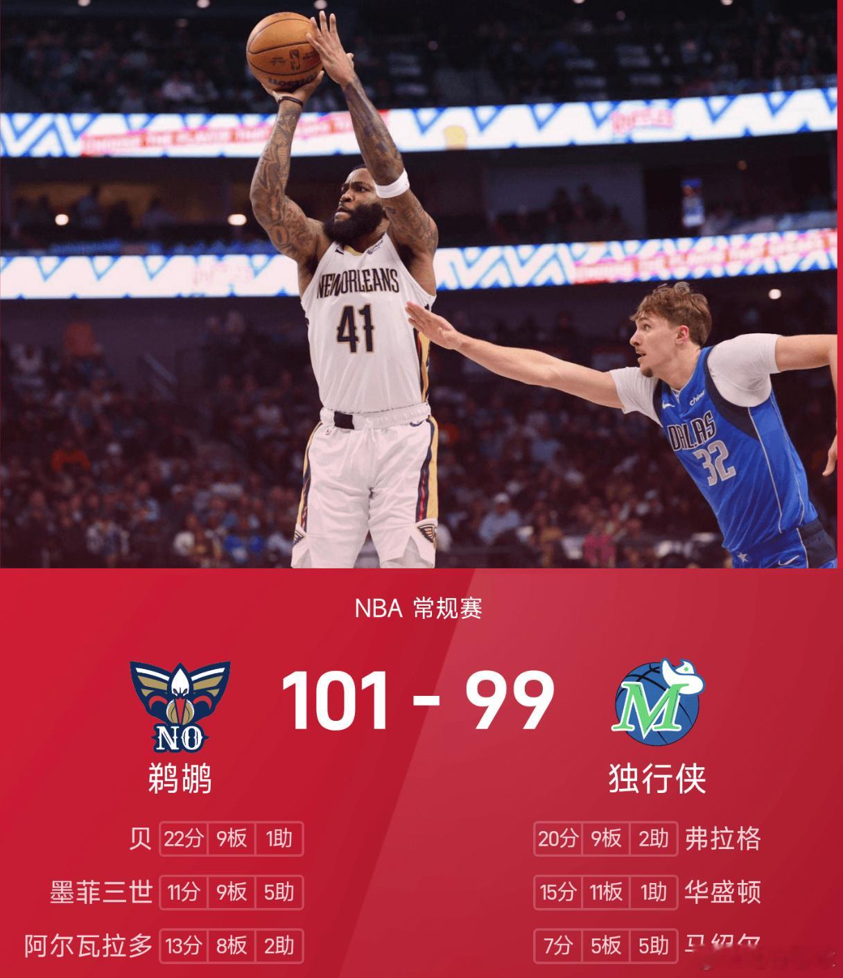 双方全场战罢,独行侠99-101不敌鹈鹕。