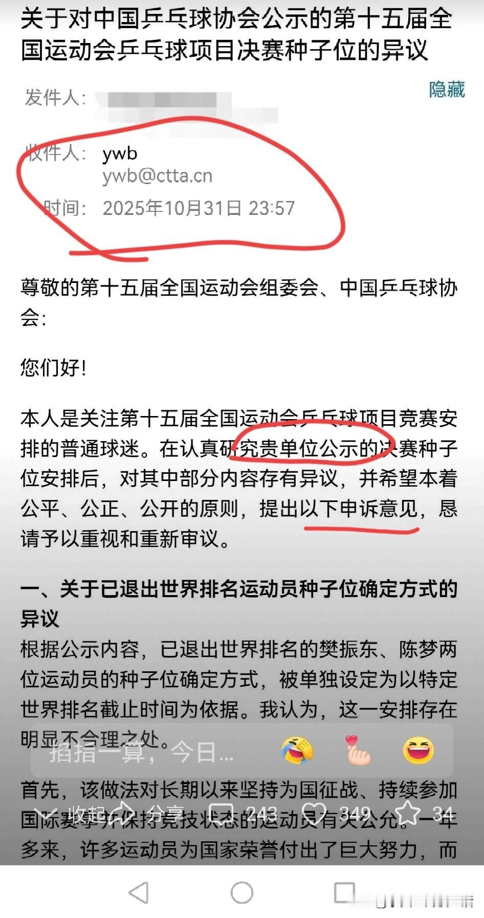 一场全运会, 一个种子位, 让两名奥运会单打冠军 再次卷入舆论争议。 并且被扣上了 “重个人荣誉, 轻国家需要”的帽子。 收件人是ywb ywb又是谁呢? 当初退赛引起的舆论, 一年了才安静点, 如今又掀起来, 不知道是故意还是无意。 随机掉落呗, 管他第一轮遇到谁, 拿着拍子使劲抡就是了, 菜就是菜, 强就是强。