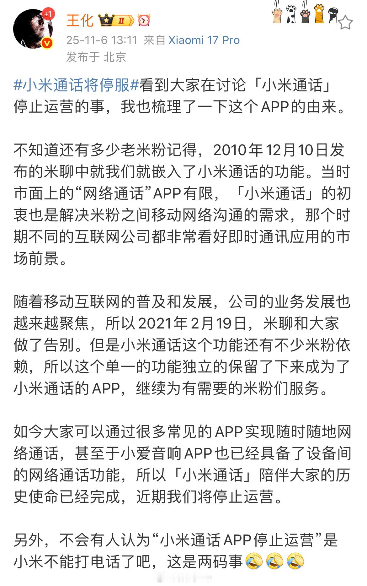 小米通话将停服小米通话APP停止运营而已,没想到这么多人关注,其实发生在小米身上这种事很多,例如小米汽车补胎还能被网暴!