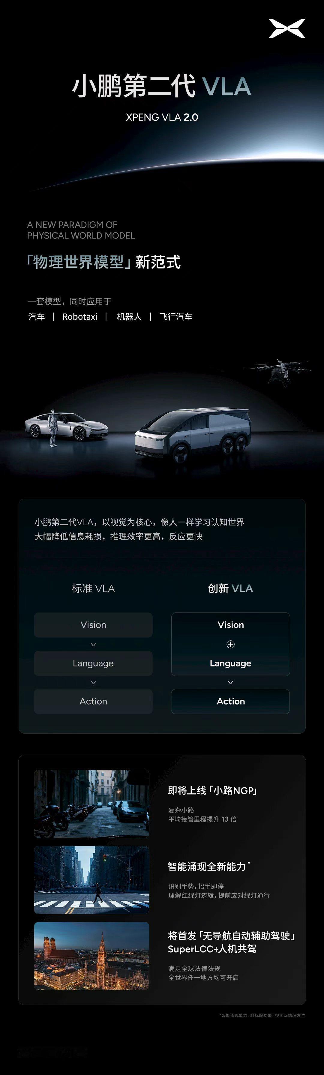 基于 第二代 VLA ,不仅能在国内使用,还能提供小鹏汽车在海外道路上,具备真正的识路能力,「无导航自动辅助驾驶」Super LCC+人机共驾下,有路就能用。为技术出海,打下扎实基础。