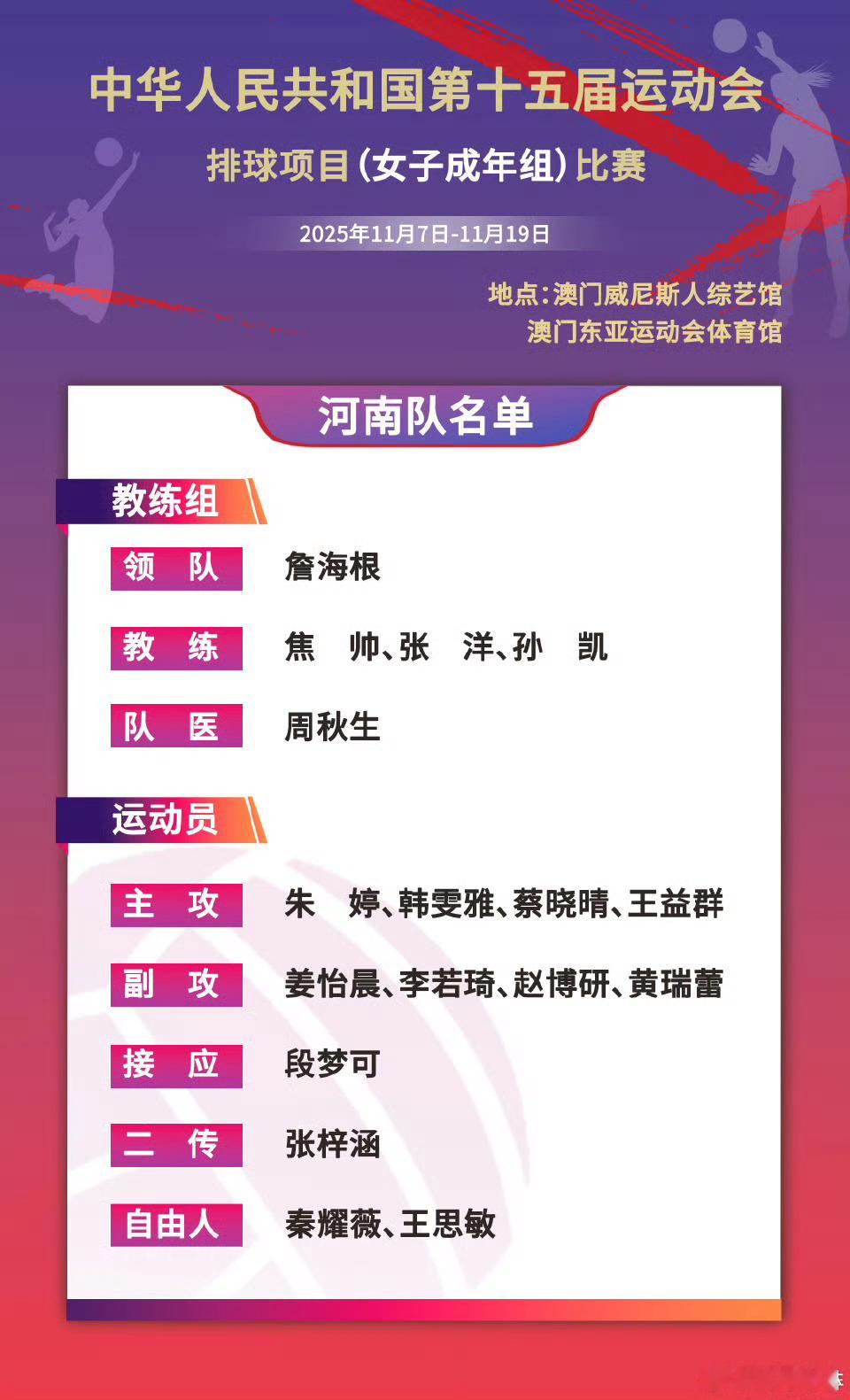 朱婷[超话] 全运会河南女排名单,朱婷领衔,歌星蔡晓晴看来要身兼多职咯