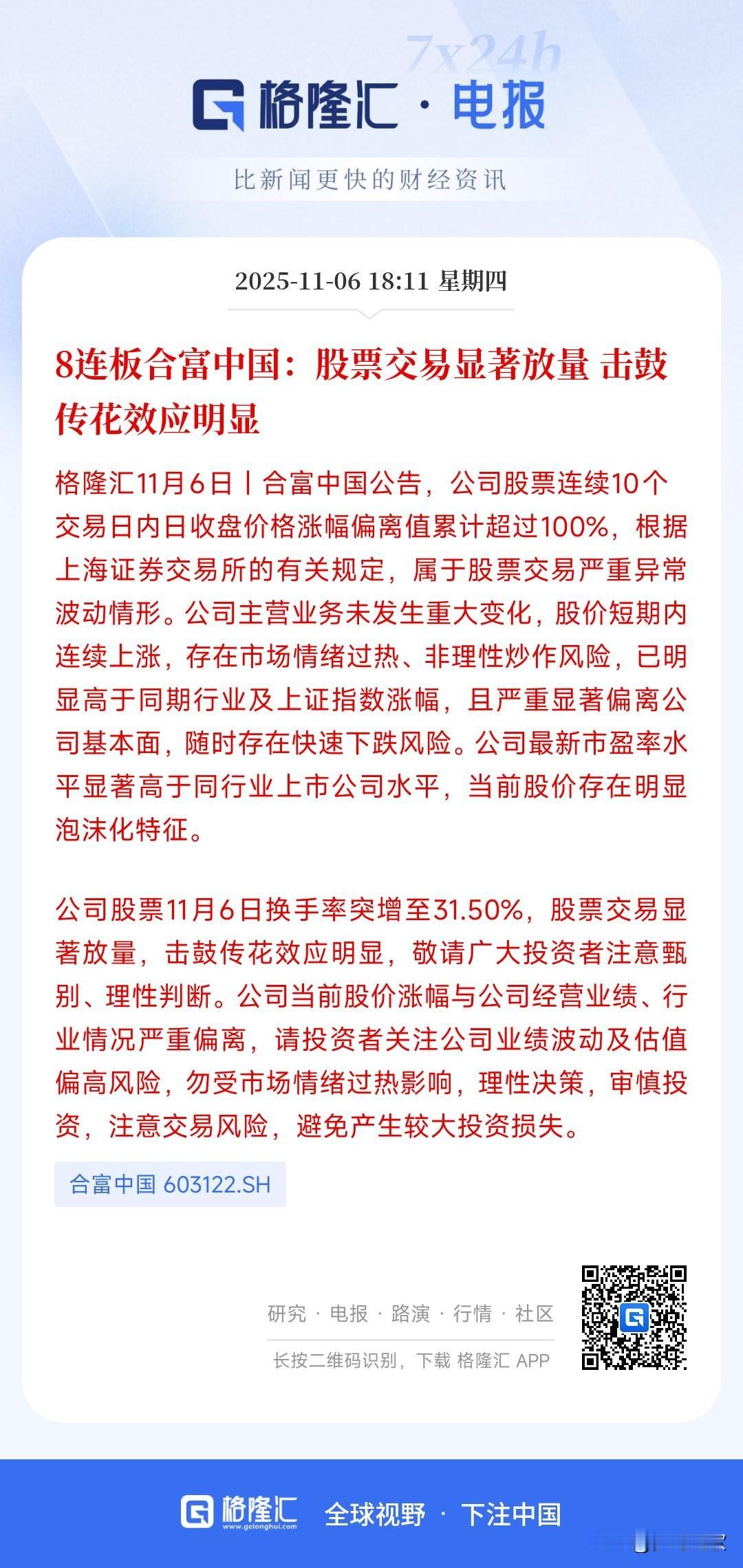 A股不是没的炒,是股民根本抓不住概念 合富中国已经8连板了,已经成为A股市场的总龙头,这个股票不是科技股,也不是什么热点股,但就是能够连板。 其实合富中国炒的是海峡两岸概念,塔是A唯一一个在台湾和大陆同时上市的企业,可以说这次炒的就是回归概念,而符合的就只有合富中国这一只股票。 今天晚上合富中国共识已经开始提示了风险,认为击鼓传花的效应明显,股票严重偏离了原有的趋势。让股民注意风险,但是从现在的情绪看短期内很难结束。
