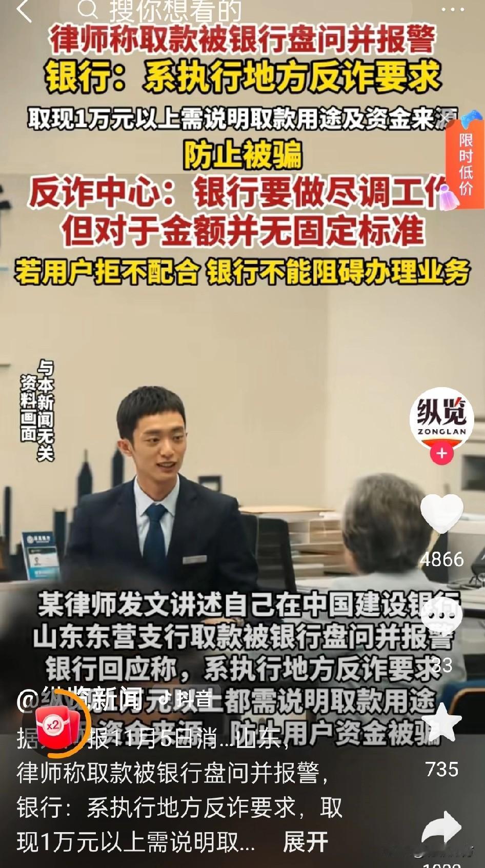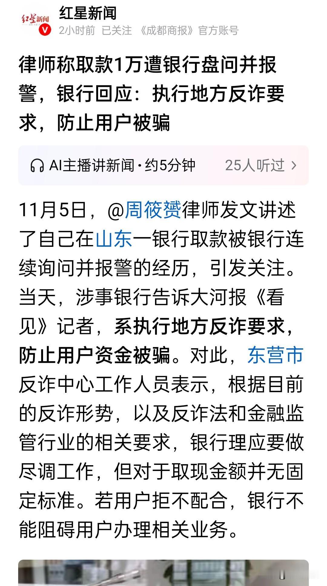一律师在银行取款一万元,被银行询问用途及资金来源,随后报警。银行回应称是地方反诈需求,用户如不配合,银行不能阻止办理业务。 银行不能阻止,就通知警方来阻止?幸亏现在电子银行够方便,要不然警方怎么忙得过来?早就听说AI已经很发达了,大数据比对交易异常应该很便捷,为什么还需要人工询问取款用途?取钱问用途 这种询问真的能防止诈骗?